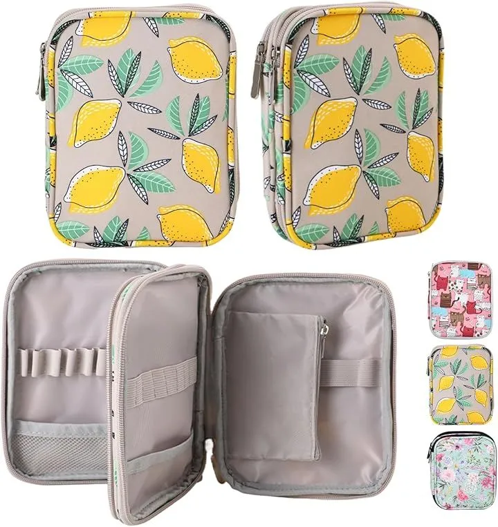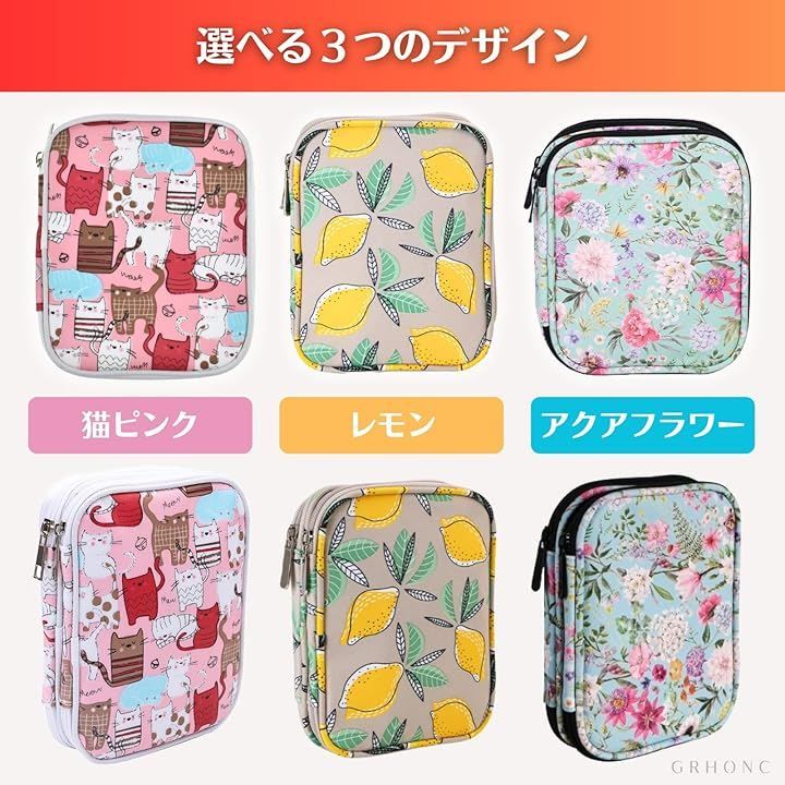 「カラー」猫ピンク/レモン/アクアフラワー「サイズ」約17.5x14x4cm / 135g「素材」オックスフォード布+ナイロン内布「機能・特徴」二層式/ゴムバンド20個(かぎ針用9・レース針用9・はさみ用1・定規用1)/ジップ付きメッシュポケット/ジップポケット/耐摩耗/防汚性/軽量/大容量/コンパクト設計