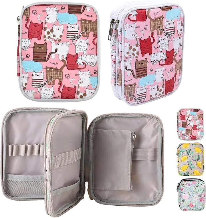 GRHONC かぎ針ケース 編み針ケース 二層式 大容量 編み物 収納 整理 軽量 コンパクト 手芸 収納ポーチ (猫ピンク)