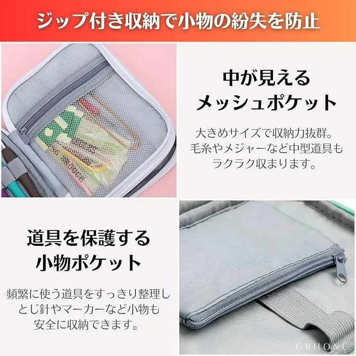 ジップ付きポケットは小物の紛失を防ぎ、編み物セットをまとめて管理したい方に最適。