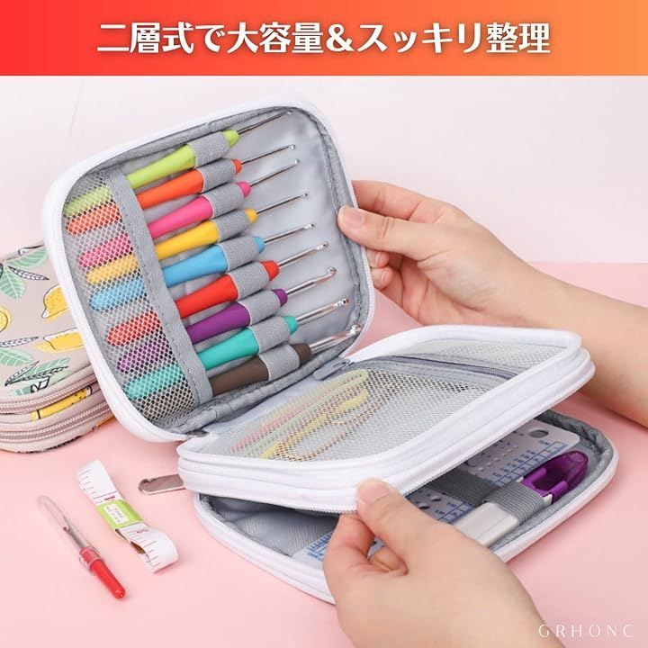 「カラー」猫ピンク/レモン/アクアフラワー「サイズ」約17.5x14x4cm / 135g「素材」オックスフォード布+ナイロン内布「機能・特徴」二層式/ゴムバンド20個(かぎ針用9・レース針用9・はさみ用1・定規用1)/ジップ付きメッシュポケット/ジップポケット/耐摩耗/防汚性/軽量/大容量/コンパクト設計