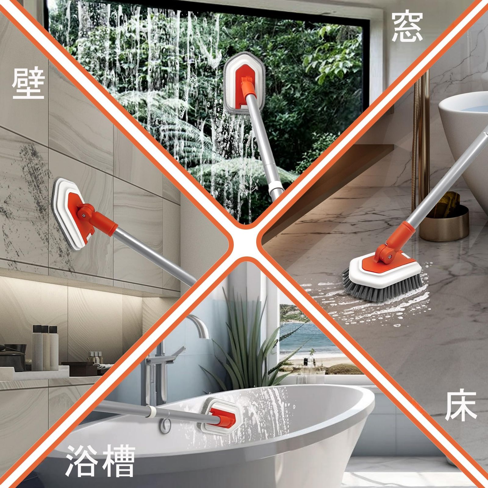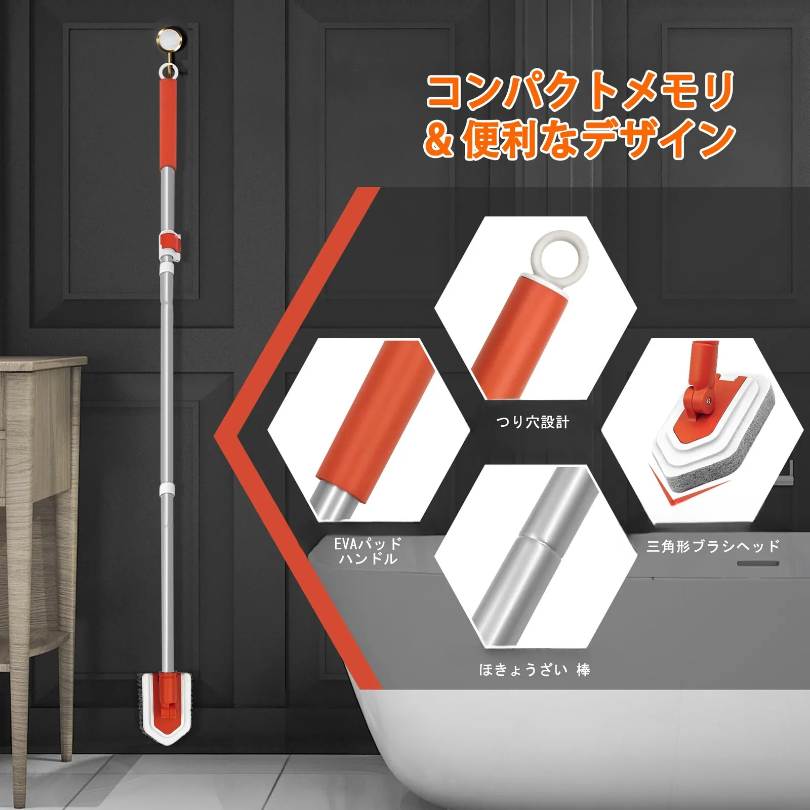 多用途風呂 ブラシ:人間工学に基づいた滑り止めグリップで設計され、浴槽、タイル、壁、ガラス、トイレ、幅木、堅木の床など、あらゆる種類の表面の完璧な家庭用掃除道具です。使わない時は、壁に掛けておけば、場所をとりません。