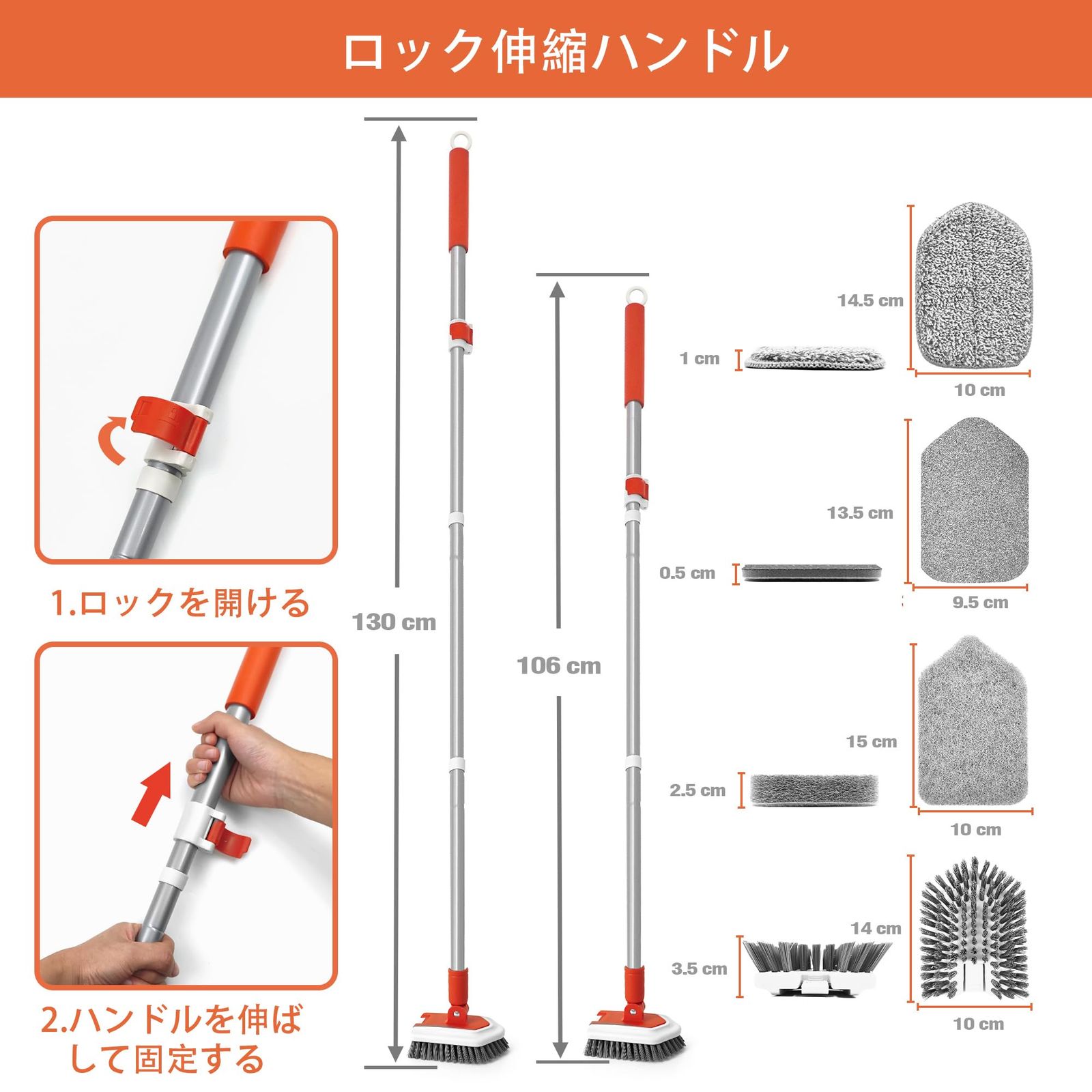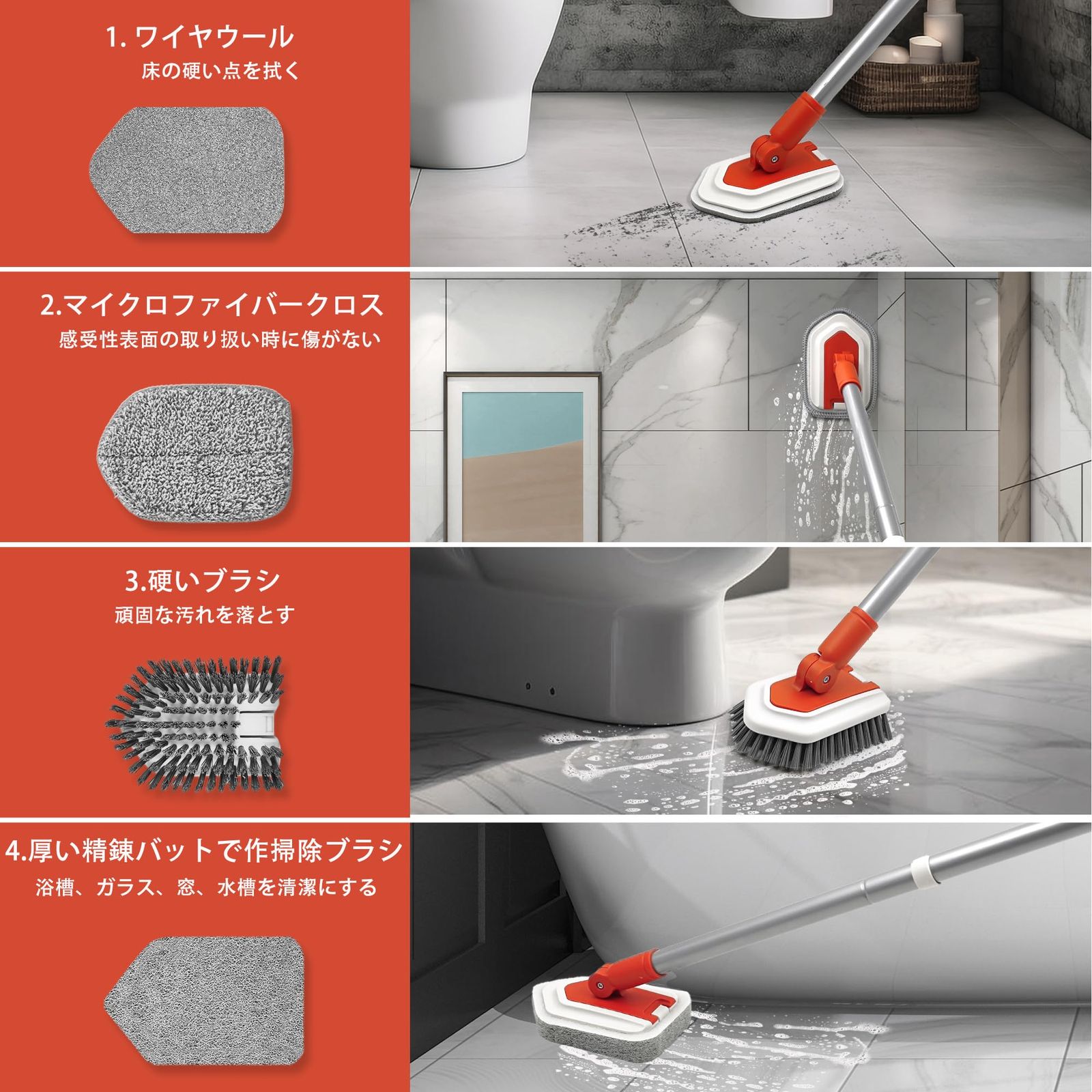 新品 JEHONN デッキブラシ掃除用ブラシ伸縮ロング106-130cm浴室の浴槽の流しの床の壁のための4つの異なったお風呂掃除 ブラシの頭部