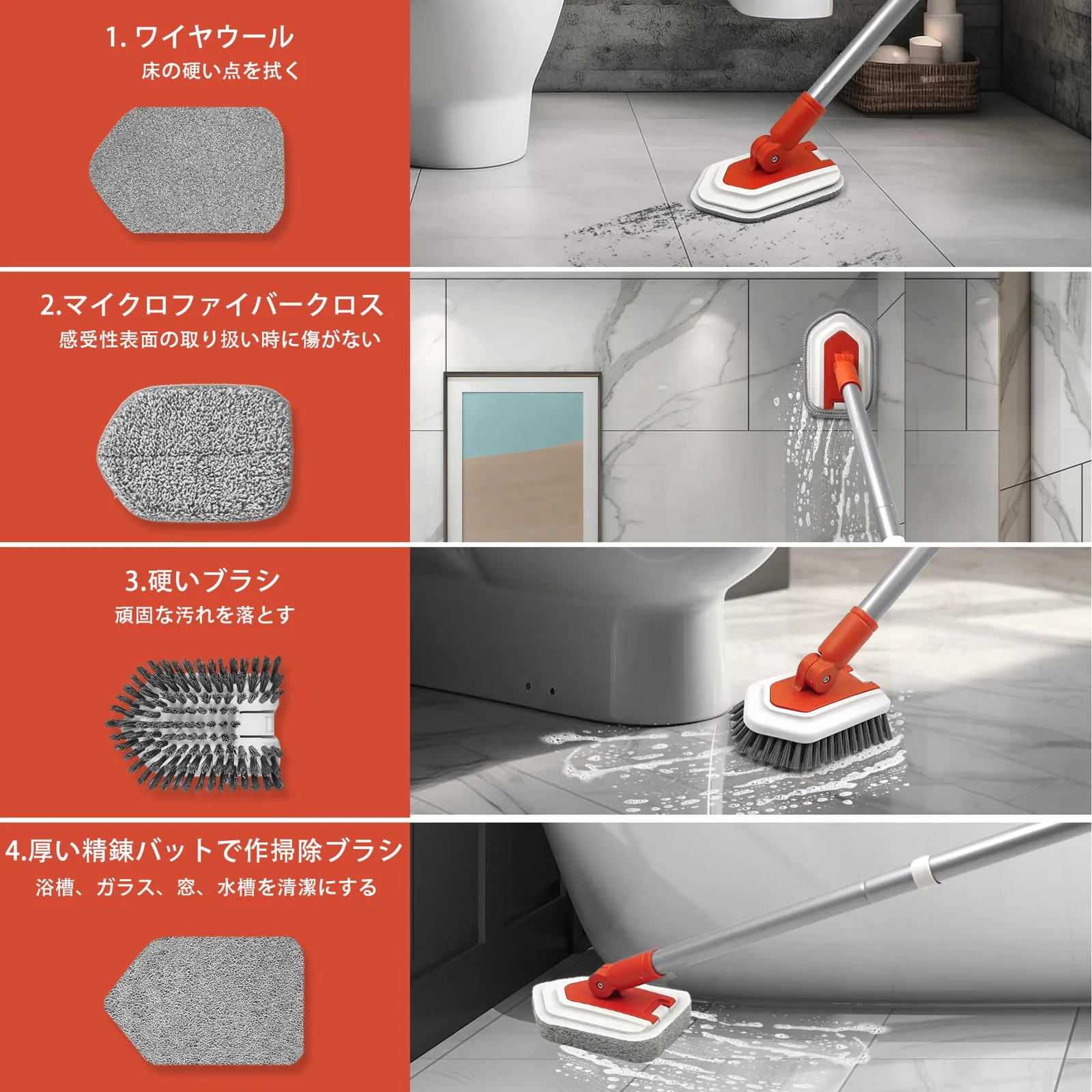 4種類のブラシヘッド:デッキブラシ ベランダには4種類のブラシヘッドが付属しています。スチールウールは床の頑固な汚れを、マイクロファイバーパッドは敏感な表面を、タワシパッドは浴槽を、そして硬い毛のブラシは頑固な汚れを取り除きます。