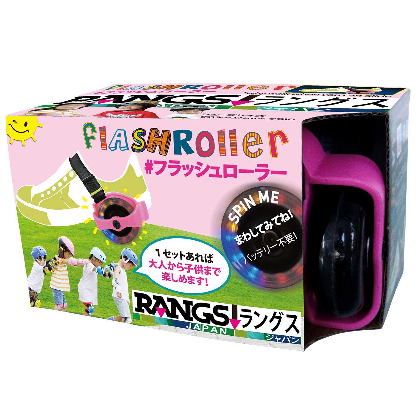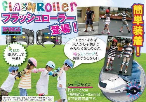 サイズ調整可能アジャスタブル。幅もストラップも調整できるから、1セットあれば大人から子供までみんなで楽しめる。シューズサイズは約19~27cm(横幅65~86mm)まで装着可能。ローラー部分は電池なしで、レインボーカラーで光る。