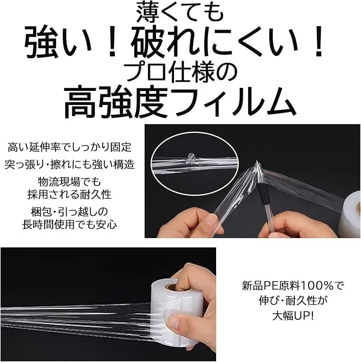 素材: PE(ポリエチレン)100% カラー: 透明 主な用途: 段ボールの結束・まとめ、荷崩れ防止、梱包資材、防水・防塵対策、結束、運送、物流、引っ越し など
