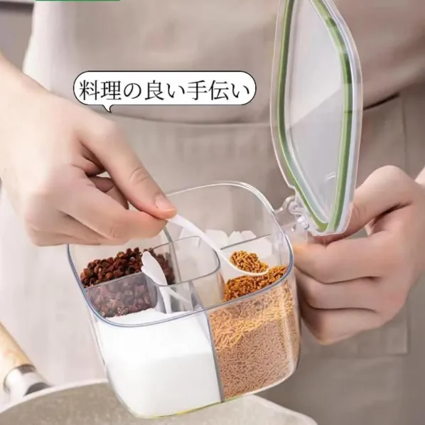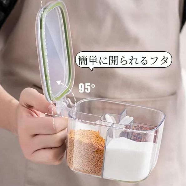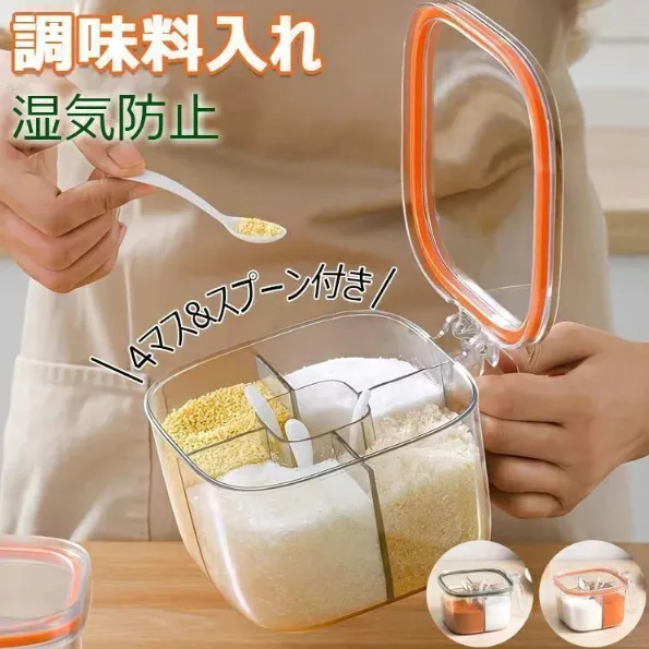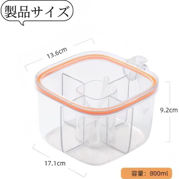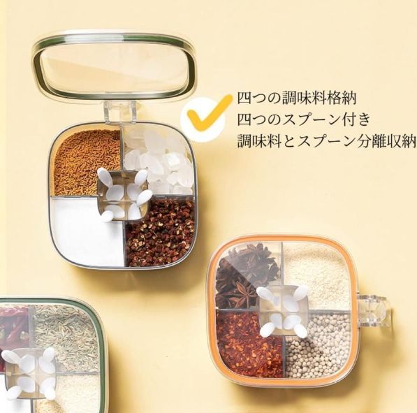 【個別収納できるスプーン付き】四つの調味料入れ箇所、四つのスプーンが付きです。スプーンが真ん中にある単独の格に個別収納できます。スプーンが調味料に埋もれず衛生的です。