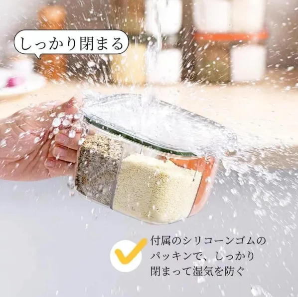 【塩や砂糖が固まりにくい】調味料がかたまりにくい、パッキンがついたスリムな調味料ポットです。しっかり閉まって湿気・乾燥を防ぎ、調味料の鮮度を保ちます。