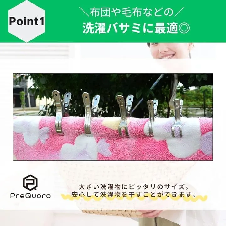 「風にも負けない超強力グリップ。」PreQruooの布団ばさみ(洗濯バサミ)は、幅広16cmの大型サイズで羽毛布団や毛布もがっちり固定。