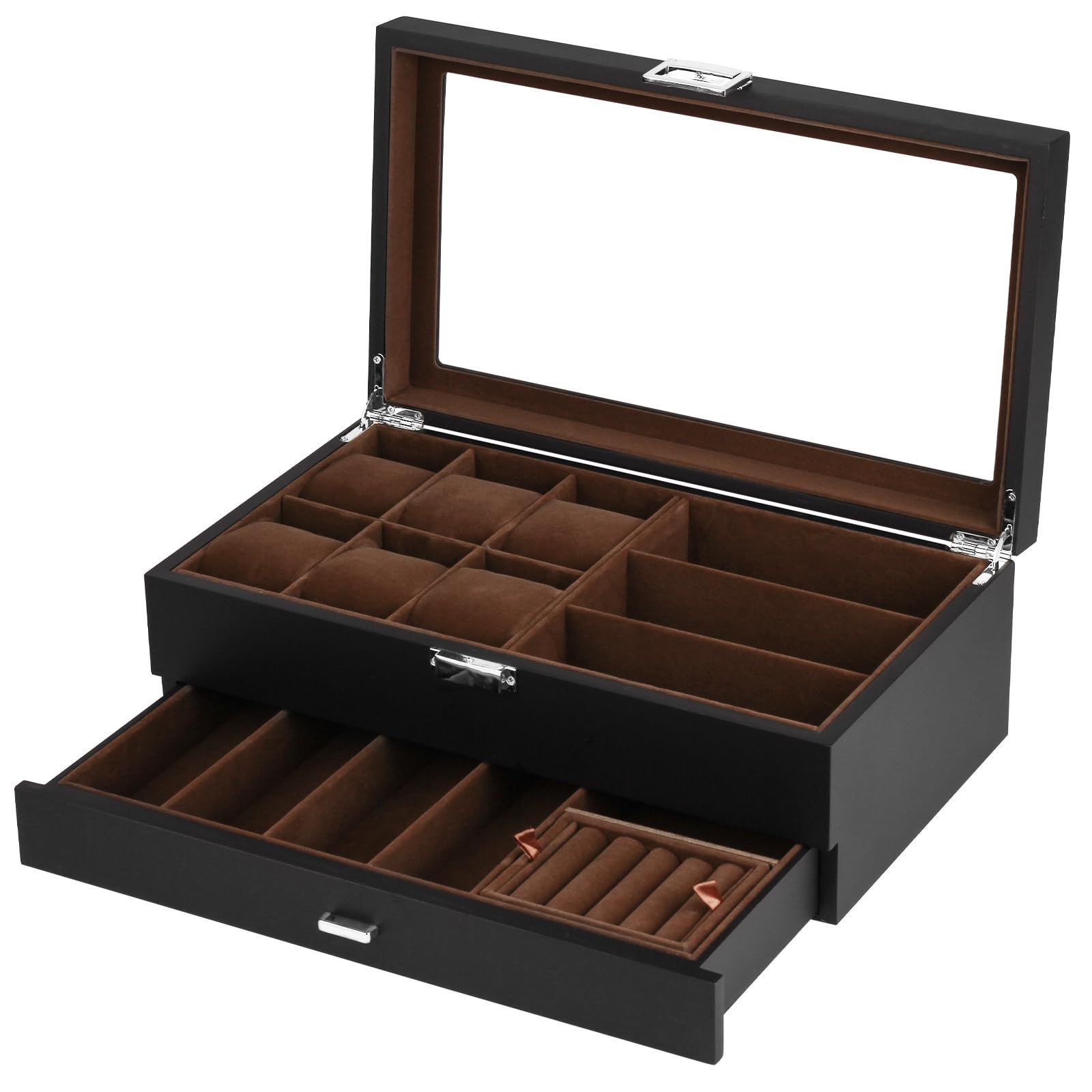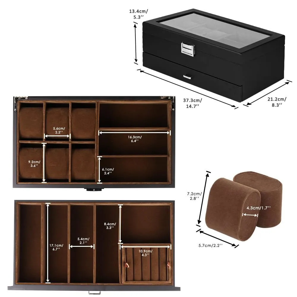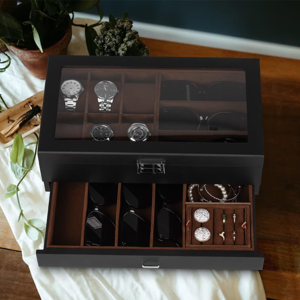 収納ボックス 腕時計6本 サングラス7本 アクセサリー 指輪 ブレスレット 収納可能 眼鏡 ジュエリー コレクションケース 高級 2層 木製 時計ケース