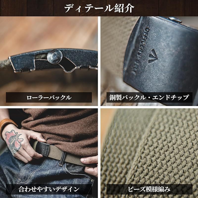 【商品説明】 ミリタリースタイル編みベルト:ミリタリースタイルの編みベルトは、頑丈な素材とクラシックな編み柄を採用し、控えめながらも力強い印象。スラックスやカジュアルパンツと合わせた通勤スタイルでは、落ち着きのある印象を保ちつつ、ディテールにこだわった質感をプラス。オフィスや通勤中でも簡単にコーディネートでき、実用性と個性を両立させ、全体のスタイルをきちんと引き締めます。 ビーズ編みベルト:旅行中、ビーズ編みのベルトは頑丈で耐久性が高く、経緯3×2本の糸で編まれているため、しっかりと耐久性を確保。デニムやワークパンツと合わせれば、搭乗や観光、ハイキングでも簡単に着用でき、耐久性と快適さを兼ね備えます。シンプルで合わせやすいデザインにより、旅先でのコーディネートも実用性とヴィンテージ感を両立させ、気軽に持ち運べます。 特別仕様ディテール:銅製ローラーバックルと特製の通気孔付き尾錠を採用し、精巧に仕上げられています。穴を開けずにスライドで固定可能で、ウエストサイズを自由に調整でき、手触りも重厚感があります。スラックスやワークパンツと合わせれば、日常のオフィスや短距離のビジネス外出に最適で、着用の利便性を高めつつ、落ち着きとプロフェッショナルさも兼ね備え、ディテールが高品質感を演出します。 銅製バックル:銅製バックルと6cmの尾錠は、アンティーク風メッキ仕上げに、幅広の矢印モチーフと英文字刻印を組み合わせ、ヴィンテージ感と遊び心を演出。デニムやカジュアルパンツと合わせれば、授業やサークル、カジュアルな活動でも、キャンパススタイルを簡単に着こなせます。ディテールは控えめながらアクセントになり、若々しさとセンスを兼ね備えたキャンパスコーディネートを完成させます。 ご使用上の注意:洗濯機での洗濯は銅製パーツの酸化を早める可能性があり、バックルが他の衣類に引っかかりやすくなります。お手入れの際は十分ご注意の上、洗濯機の使用は避けてください。