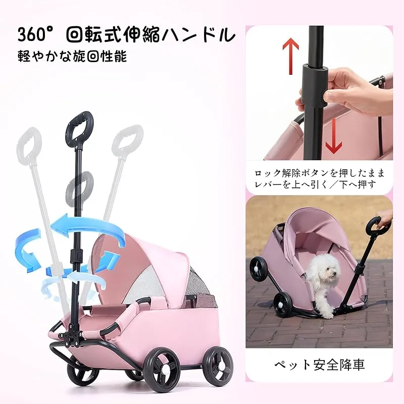 【収納便利】折り畳みペットカートは 一握りで簡単に折りたたみ、場所が取らず、コンパクトに収納できます。旅行中でもとても便利です。 車輪は路面からの振動を軽減するように大きめの車輪を採用しており、まだ振動を吸収するに適したEVA素材を使用しています。4輪ペットカートを乗車中にはペットにやさしいです。
