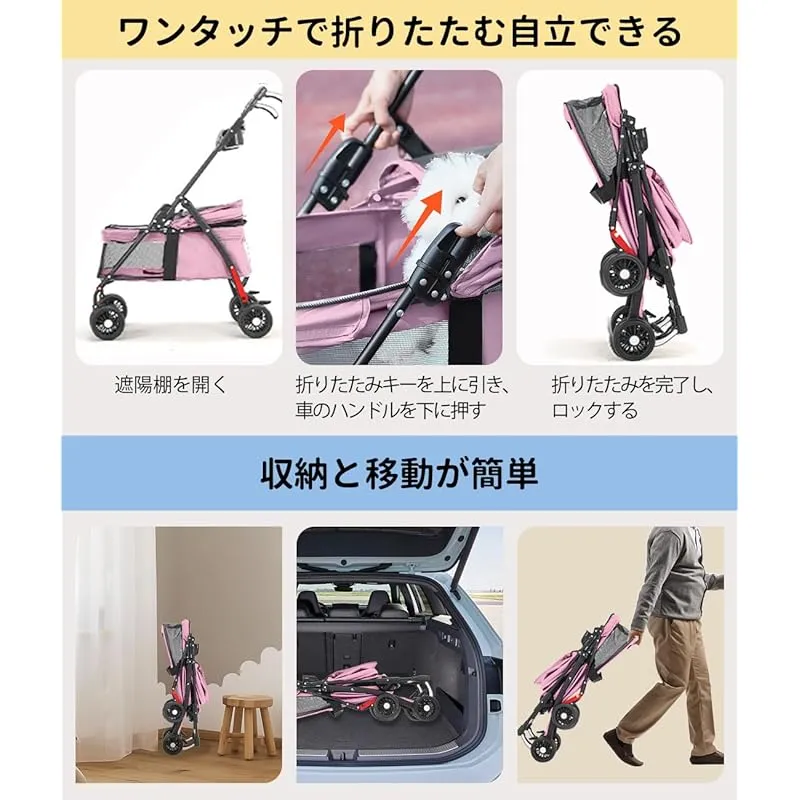 【ワンタッチ折りたたみ&軽量で持ち運びラクラク】片手で操作できるワンボタン折りたたみ式を採用。使用後は素早く折りたたんで、収納も移動もスムーズに。 軽量フレーム設計により、女性や高齢者の方でも簡単に持ち運びできます。 折りたたみ時はコンパクトサイズになり、玄関・クローゼット・車のトランクなど省スペースにも対応。このペットカートは、足腰が弱った老犬の介護やサポートに最適です。また、小型犬、中型犬、猫など、さまざまなサイズのペットに対応可能です。内部スペースが広く、ペットが快適に過ごせるように設計されています。愛するペットの健康と快適性を考えたプロダクトです。