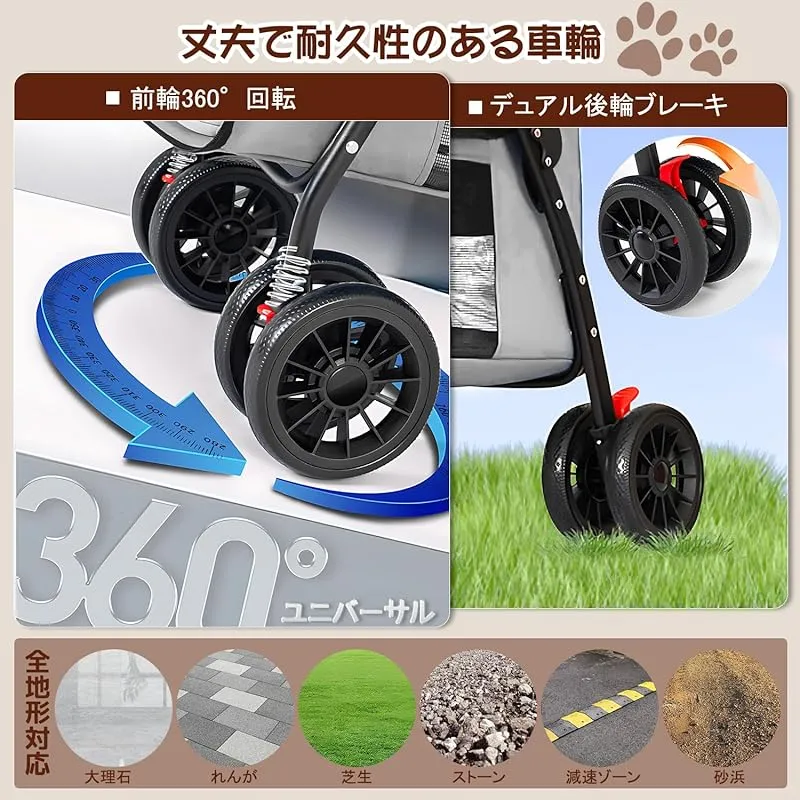 【プロ級安定設計】360°回転ホイール+大型PUタイヤで小回り抜群。独自サスペンションシステムが振動を軽減し、凸凹道でも安定走行。足踏み式ダブルブレーキと脱走防止リードで、繁忙な街中や急斜面でも完全制御。 ??