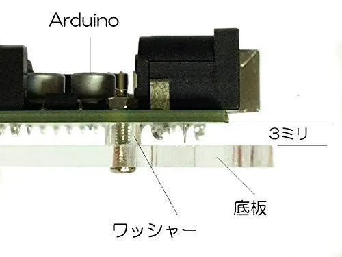 【仕様】組立後サイズ約:長さ79.5mm、幅64.5mm、高さ21mm 材質:アクリル 重量:約35g 基板が剥き出しで背面ショートなどが心配な収めるクリアケースです。 シールドによってはケースに入れたまま装着出来るものと出来ないものがあります。 Arduinoのコンパクトさを損ねることのない、必要十分なサイズのケースです。 Arduinoの基板は、金属ビスとナット、透明な3ミリ厚のワッシャー4組を使い底板に確実に固定できます。 底板とArduinoの間に必要以上の隙間がない為、この手のケースの中ではトップクラスの薄さとなっています。(アクリル板の底面から天面の間18ミリ、ビス頭とナットを含めても21ミリの厚さ) 透明度の高いアクリル板と金属ビスの組み合わせが、基板を保護するだけに留まらず、洗練された機能美を醸し出します。 アクリル板には保護シートが貼られておりますので、組立前に剥がして下さい。 保護シートの色は、ロットにより乳白色の場合もございます。 -------------