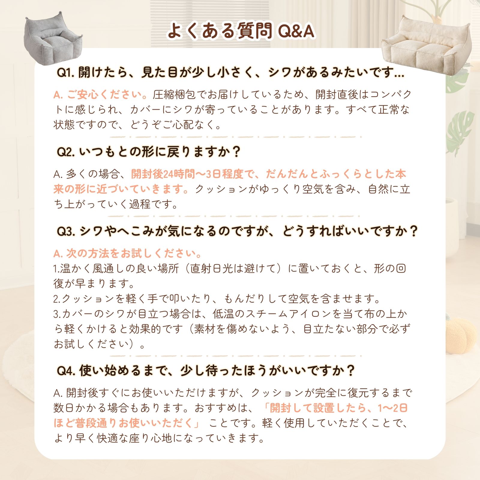 【コンパクトで場所を取らないデザイン】クッションソファは小さめのサイズで設計されており、リビングや寝室、ワークスペースなど、どんな場所にも無理なく設置できます。場所を取らないため、限られたスペースでも快適に使えます。