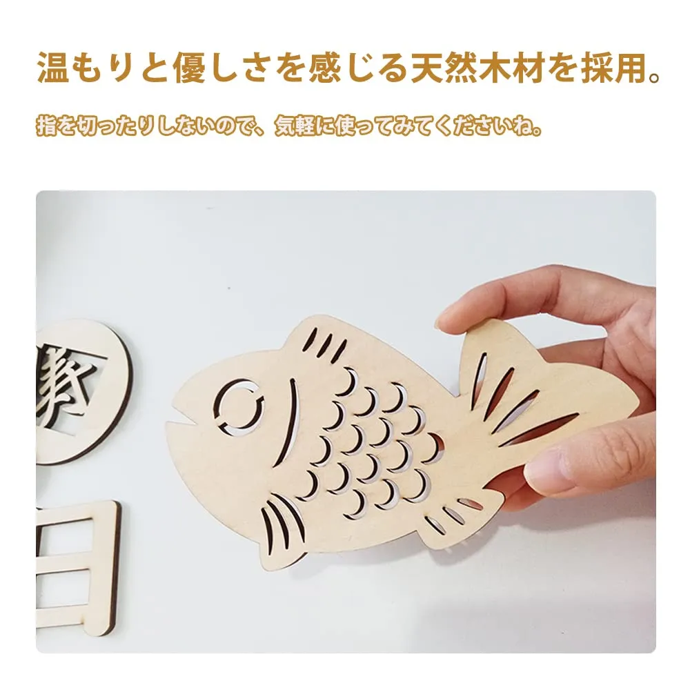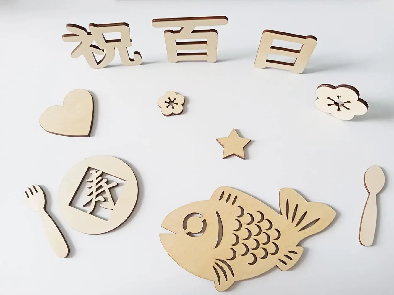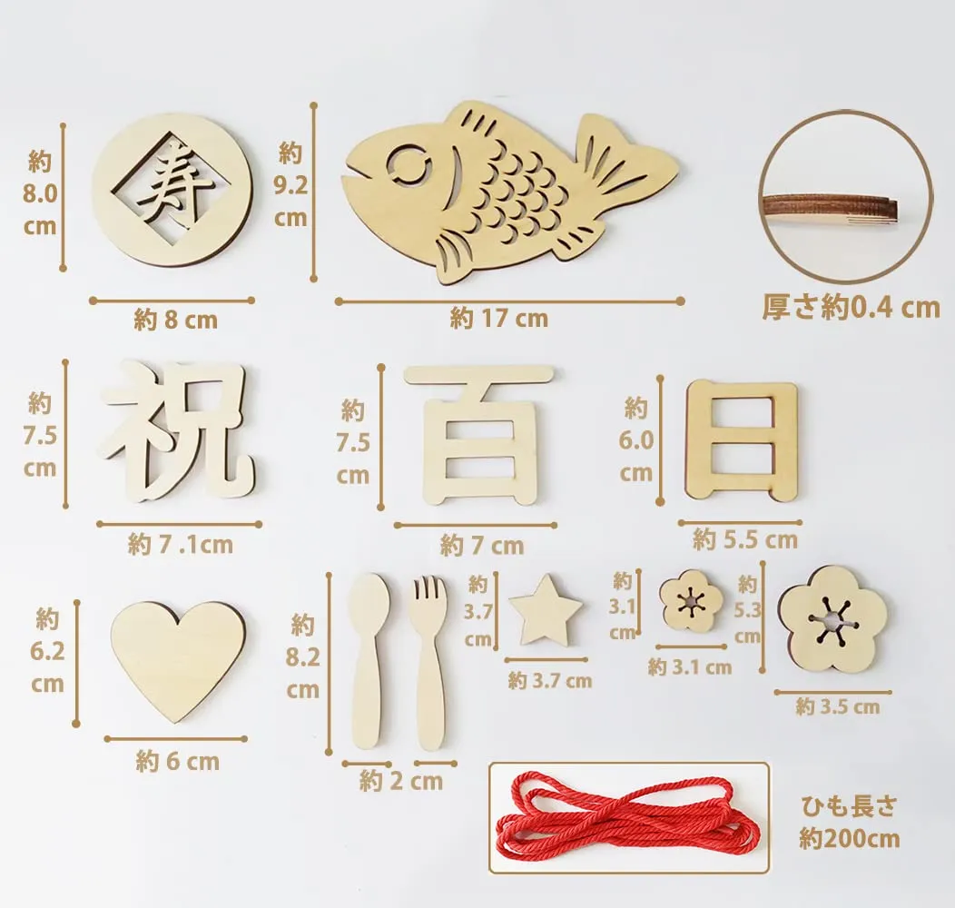 【セット内容】 ウッドバナ:1組(全11枚)、赤いひも:1本(200cm)。サイズ:百 7.5×7cm / 日 6×5.5cm / 祝 7.5×7.1cm / 寿 8×8cm / 魚 17×9.2cm / フォーク 2×8.2cm / スプーン 2×8.2cm / 花大 5.3×5.3cm / 花小 3.1×3.1cm / ハート柄:6.2×6cm / 星:3.7×3.7cm