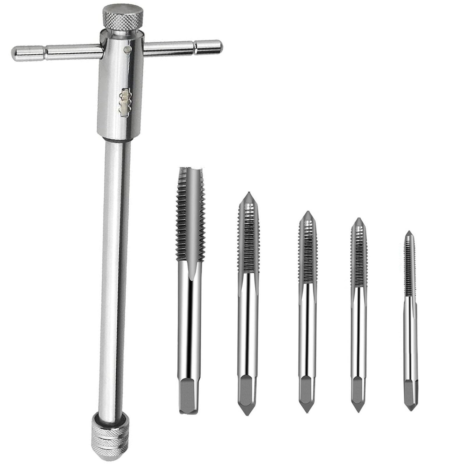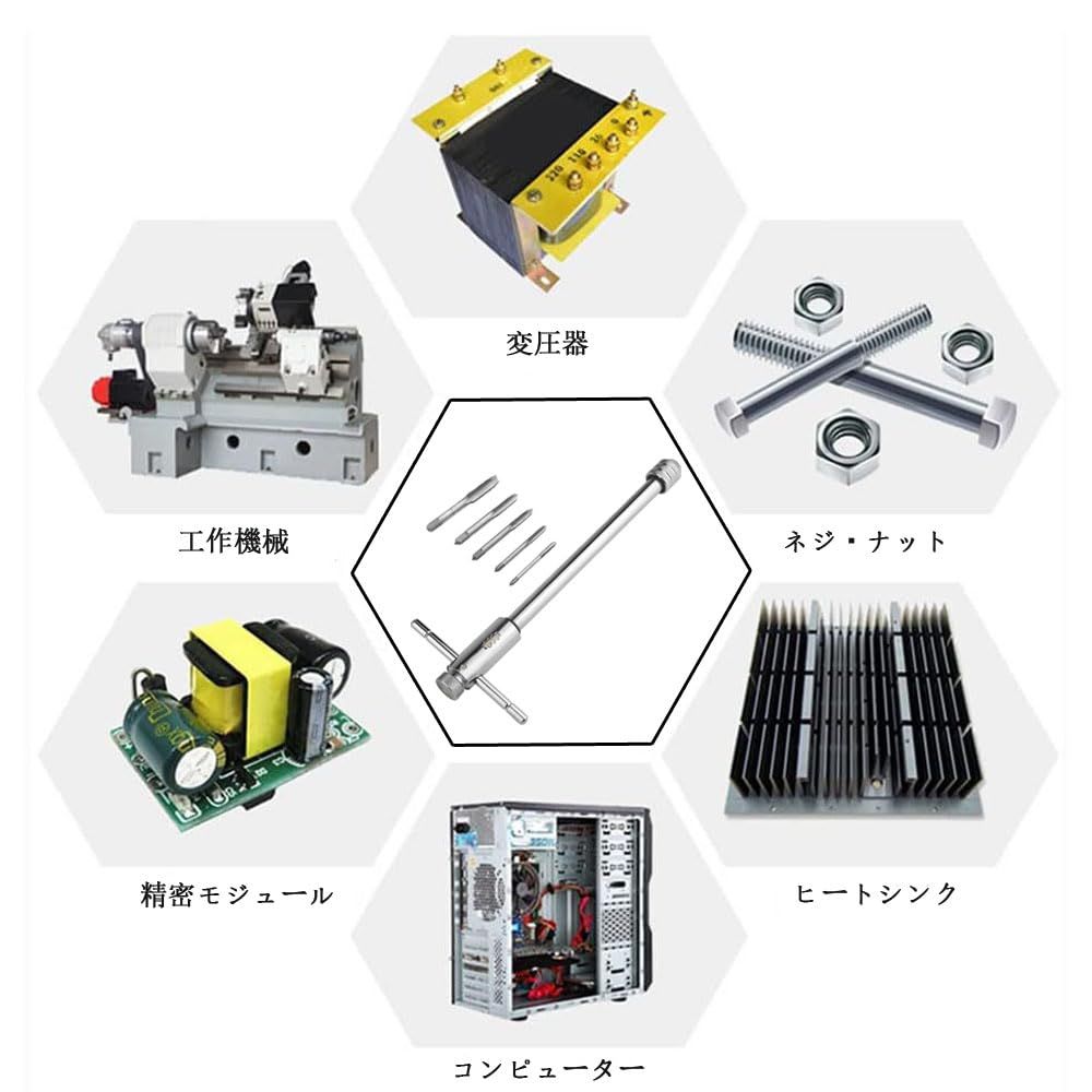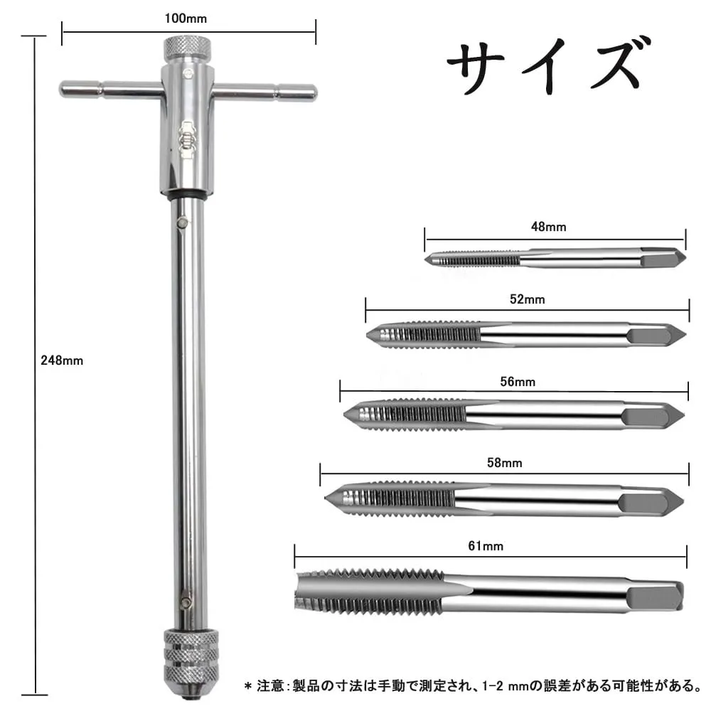 【製品仕様】セットの内容は、1個のT字型タップレンチ、5個のタップ。適用タップのサイズ:M3×0.5mm、M4×0.7mm、M5×0.8mm、M6×1.0mm、M8×1.2mm。タップレンチ本体の長さ:250 mm。(作業加工時にタップを正しい位置に挟んでください)。