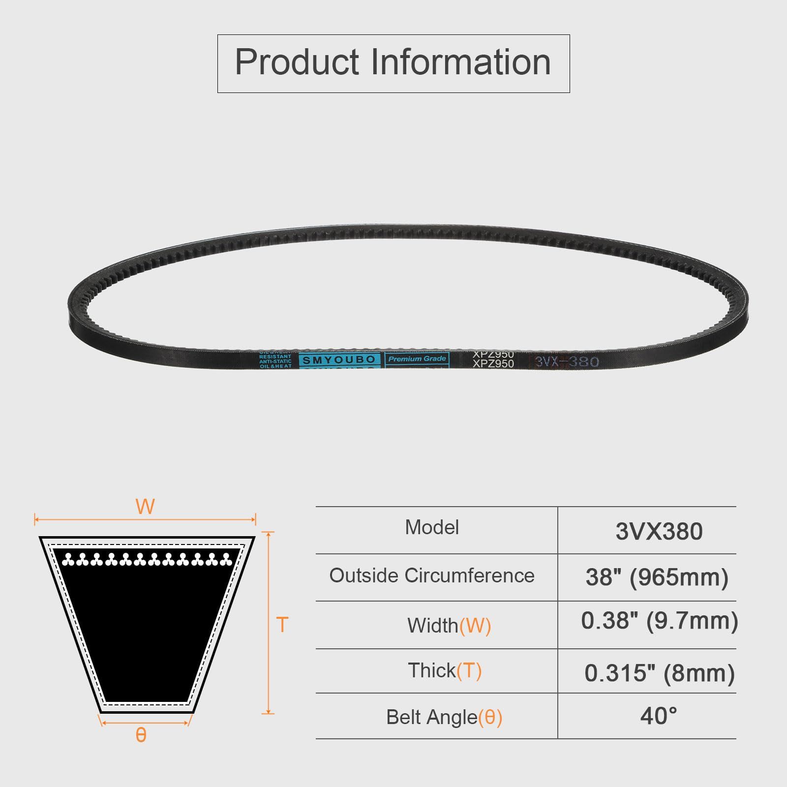 サイズ - 3VX380 コグ付きVベルト、38 (965mm) 外周 x 0.38 (9.7mm) 幅 x 0.315 (8mm) 厚さ。