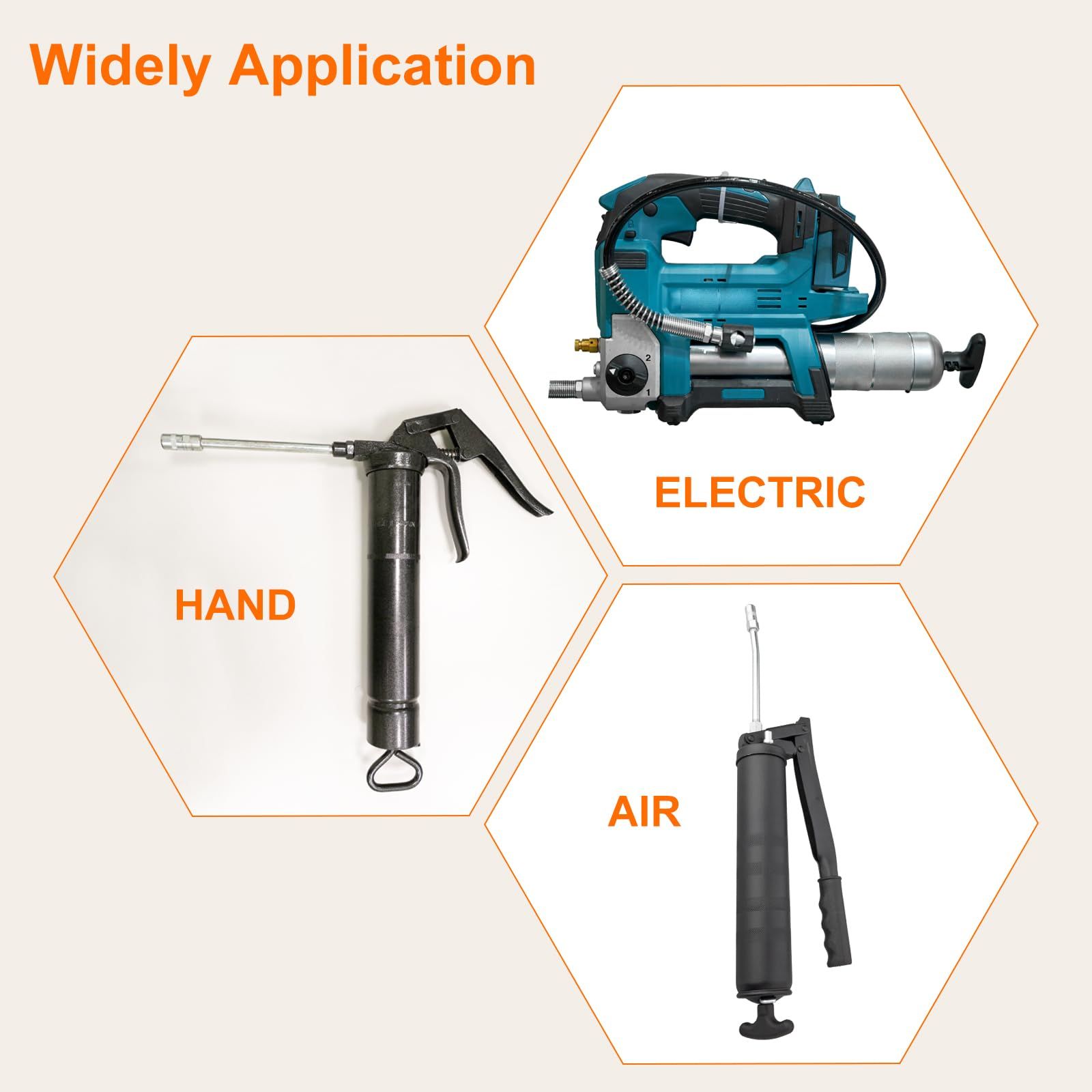 用途 - フレキシブルホースは、すべての標準1/8N PTエクステンションと標準グリ ースガ ンのホースに適合し、エア、電動、手動グリ ースガ ンにも適合します。