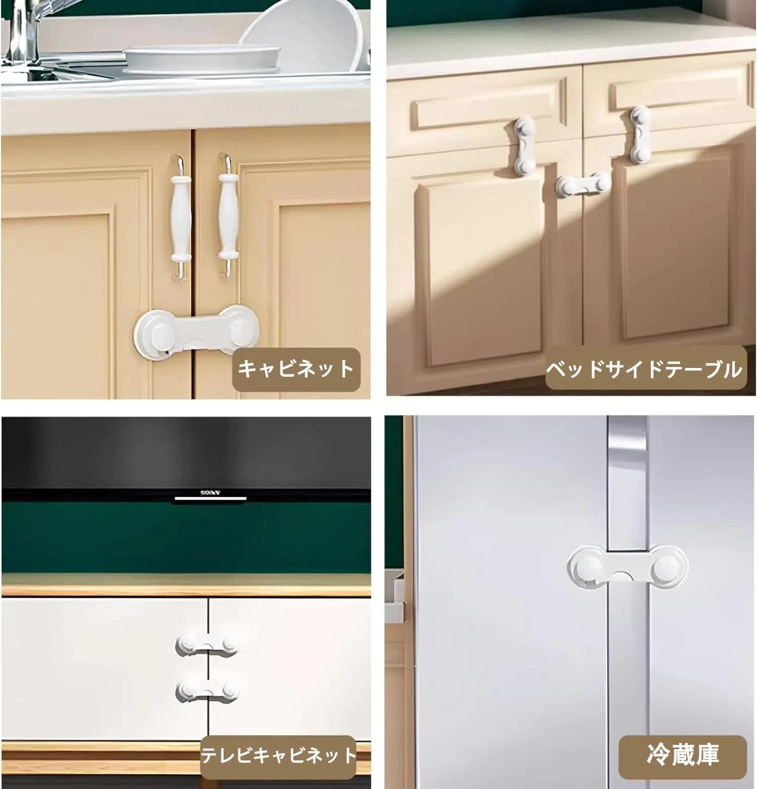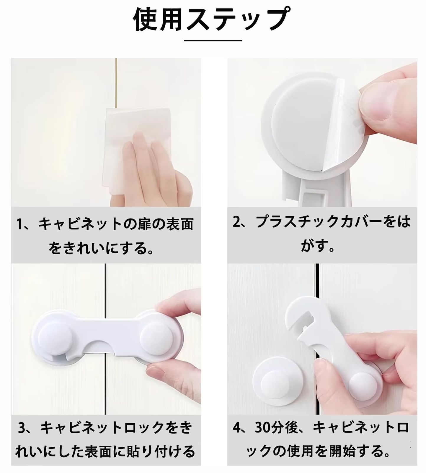 簡単取り付けで即効性。テープ付きなので、戸棚や冷蔵庫、引き出しなどに簡単に取り付け可能。開き戸ストッパーや引き戸ロックとして即座に活用できます。
