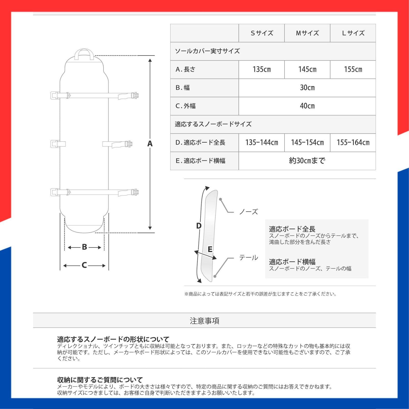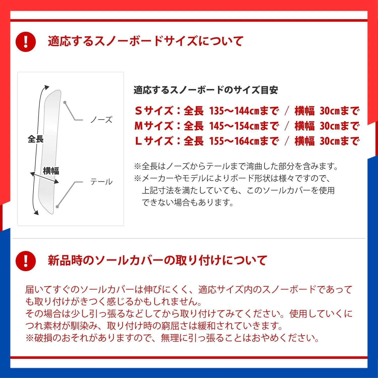 【注意事項】新品のソールカバーは伸びにくく、適応サイズ内であっても取り付けがきつく感じる場合がございます。最初は少し引っ張っりながら伸ばすように取り付けを行ってください。 伸縮性に優れたクロロプレンゴム製のスノーボードソールカバー。 自動車での移動や、屋内での保管時に、スノーボードによる傷や汚れがつくのを防ぎます。 また、持ち運び時のエッジによる怪我を防いだり、スノーボードケースへ収納する際の保護にも役立ちます。