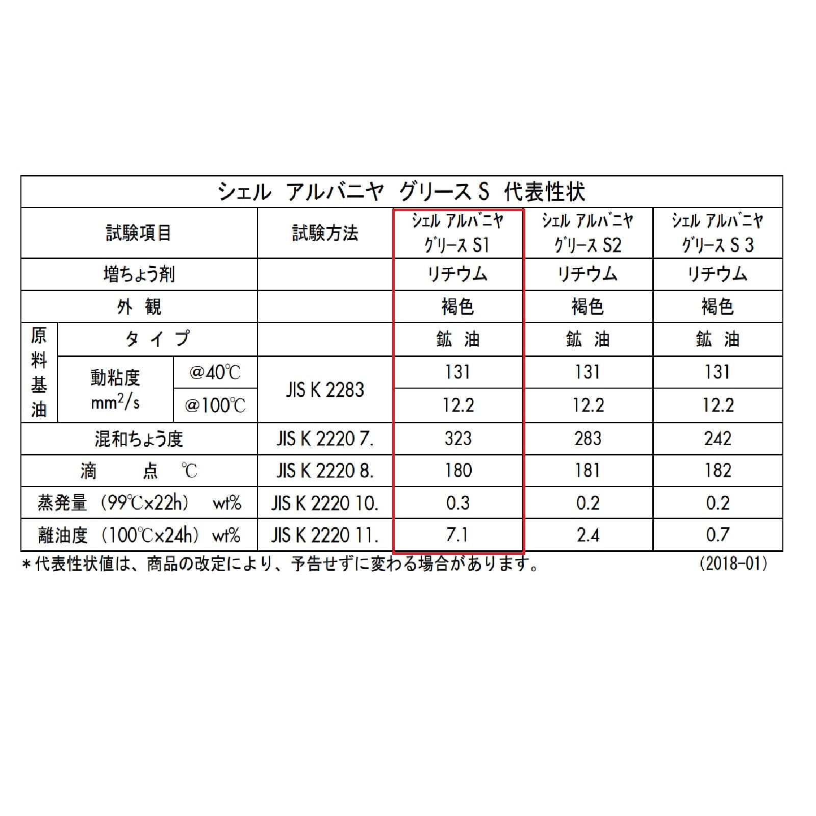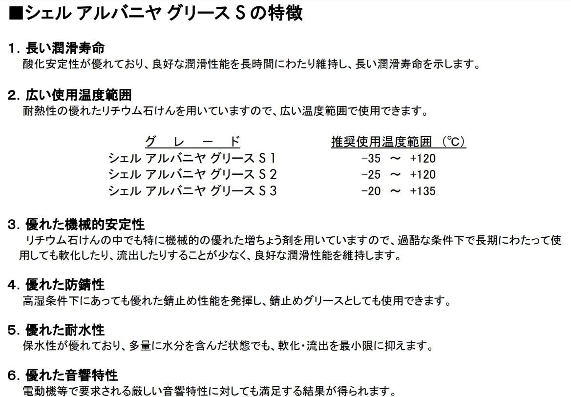 ■シェル アルバニヤ グリース S の特徴 1.長い潤滑寿命 酸化安定性が優れており、良好な潤滑性能を長時間にわたり維持し、長い潤滑寿命を示します。 2.広い使用温度範囲 耐熱性の優れたリチウム石けんを用いていますので、広い温度範囲で使用できます。 グ レ - ド 推奨使用温度範囲 (℃) シェル アルバニヤ グリース S 1 -35 ~ +120 シェル アルバニヤ グリース S 2 -25 ~ +120 シェル アルバニヤ グリース S 3 -20 ~ +135 3.優れた機械的安定性 リチウム石けんの中でも特に機械的の優れた増ちょう剤を用いていますので、過酷な条件下で長期にわたって使用しても軟化したり、流出したりすることが少なく、良好な潤滑性能を維持します。 4.優れた防錆性 高湿条件下にあっても優れた錆止め性能を発揮し、錆止めグリースとしても使用できます。 5.優れた耐水性 保水性が優れており、多量に水分を含んだ状態でも、軟化・流出を最小限に抑えます。 6.優れた音響特性 電動機等で要求される厳しい音響特性に対しても満足する結果が得られます。 配送について、商品のサイズや配送先都道府県によって最適な配送業者を選択しております。 業者・配送方法の指定は承れません。ご了承ください。 万が一の不着、紛失、誤配送の場合など、最後まで責任もって対応致しますのでご安心下さい。 宜しくお願い致します。