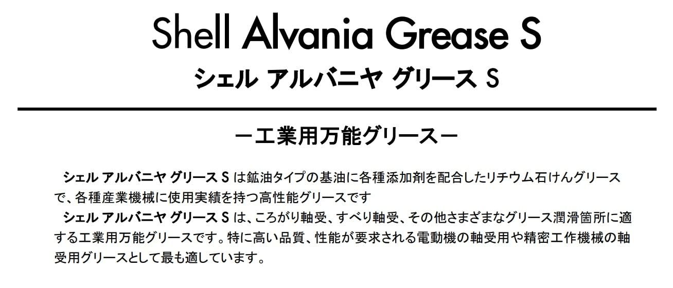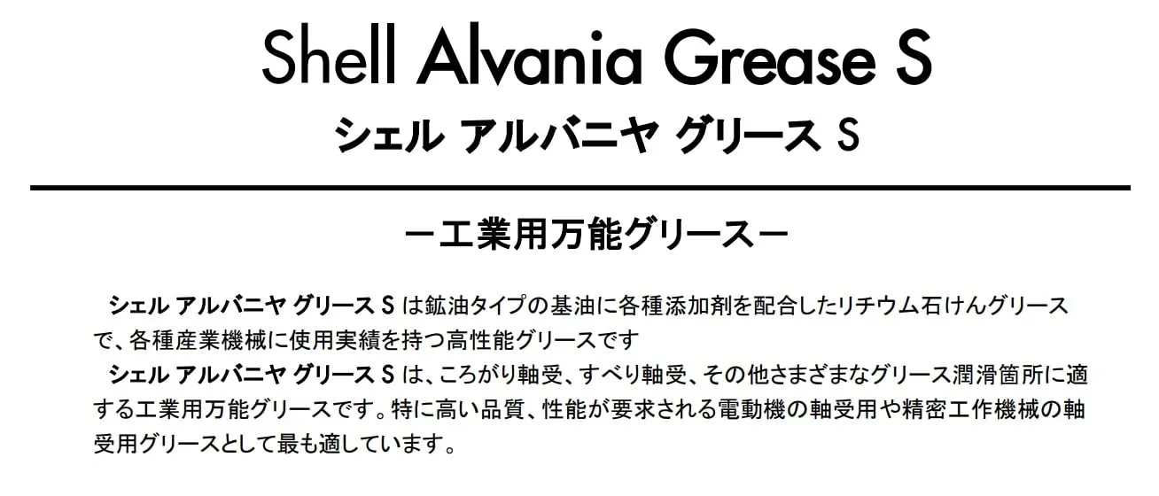 シェル アルバニヤ グリース S は鉱油タイプの基油に各種添加剤を配合したリチウム石けんグリースで、各種産業機械に使用実績を持つ高性能グリースです。