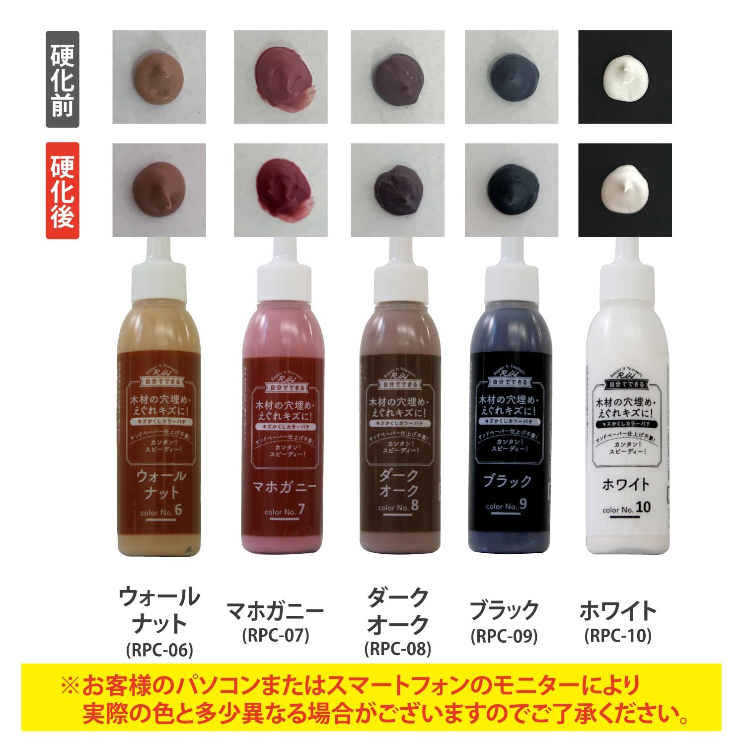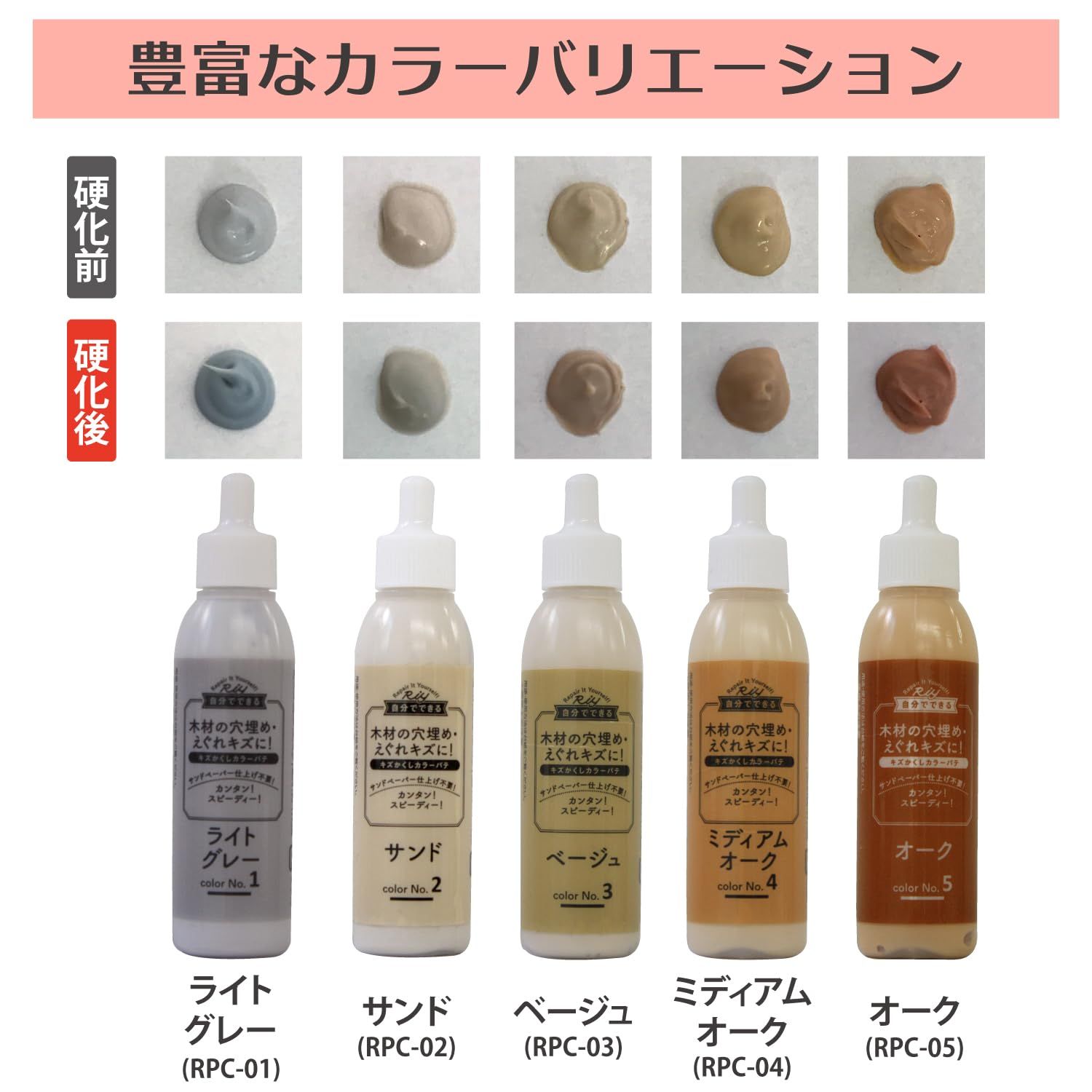 お気に入りの家具、お気に入りの空間、だからこそ自分でリペア(補修)する。 大変だったヤスリ掛けや色調合、工具による補修は一切不要! 本剤を注入して自然硬化を待つだけ。 カラーバリエーションは豊富な全10色。