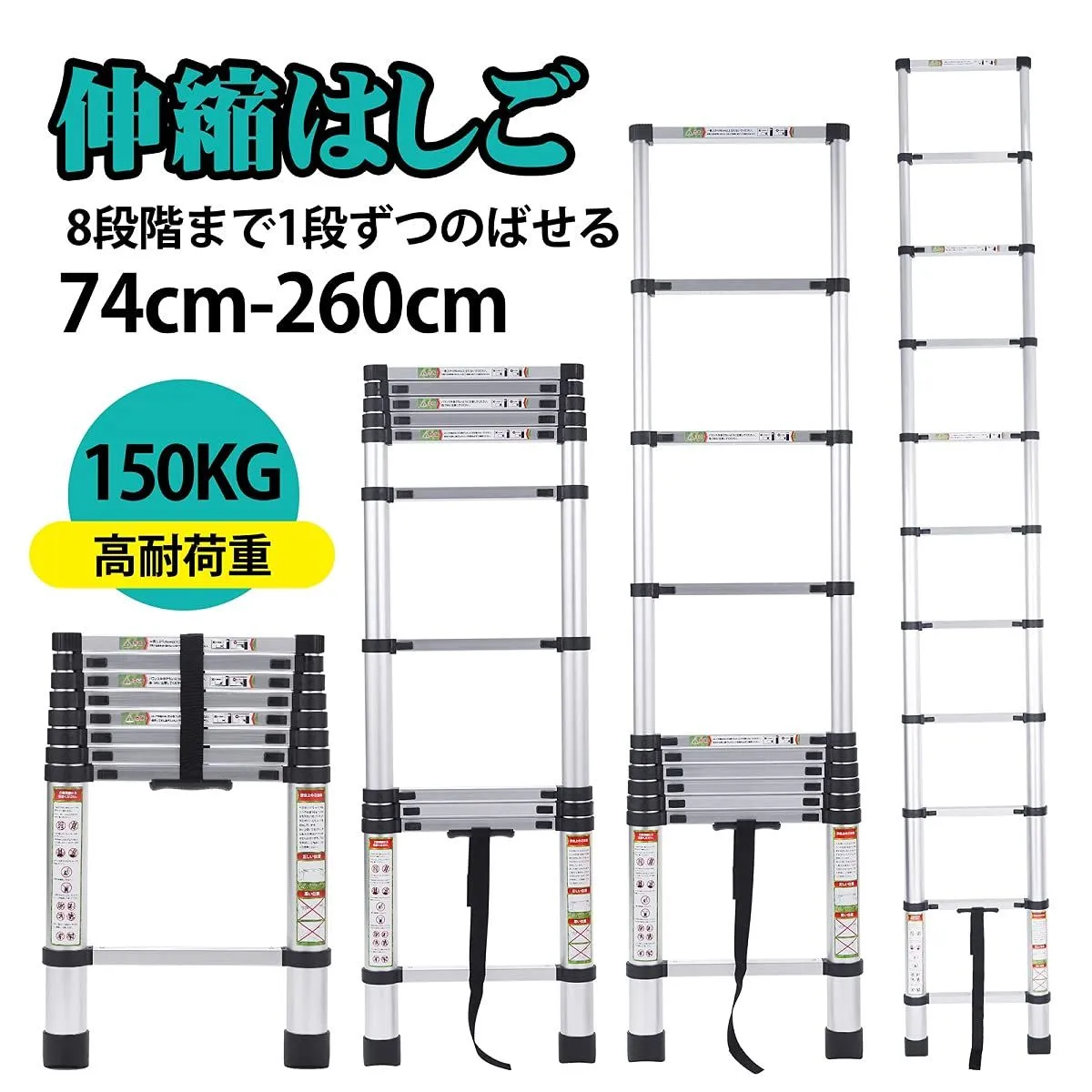 【サイズ詳細】2.6メートルタイプは折り畳み時サイズ(約):幅(足含む)46cm×奥行き7cm×高さ73.6cm 展開時サイズ(約):幅(足含む)46×高さ260cm 階段数量:ステップ9個(最上段を含めて10個)となっており、ステップの幅は各4cmとなっております。 重量:6.85kg 耐荷重:150Kg
