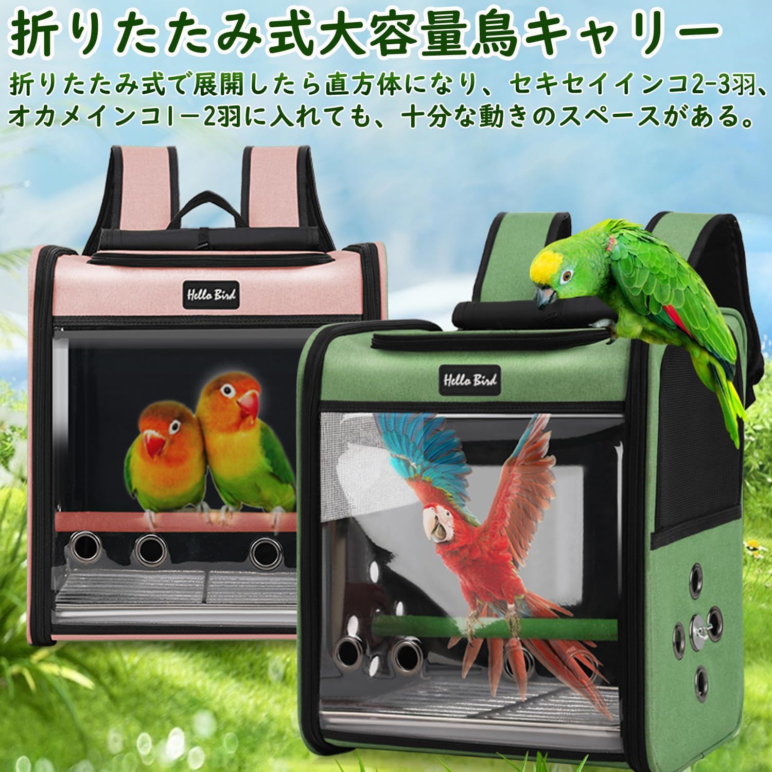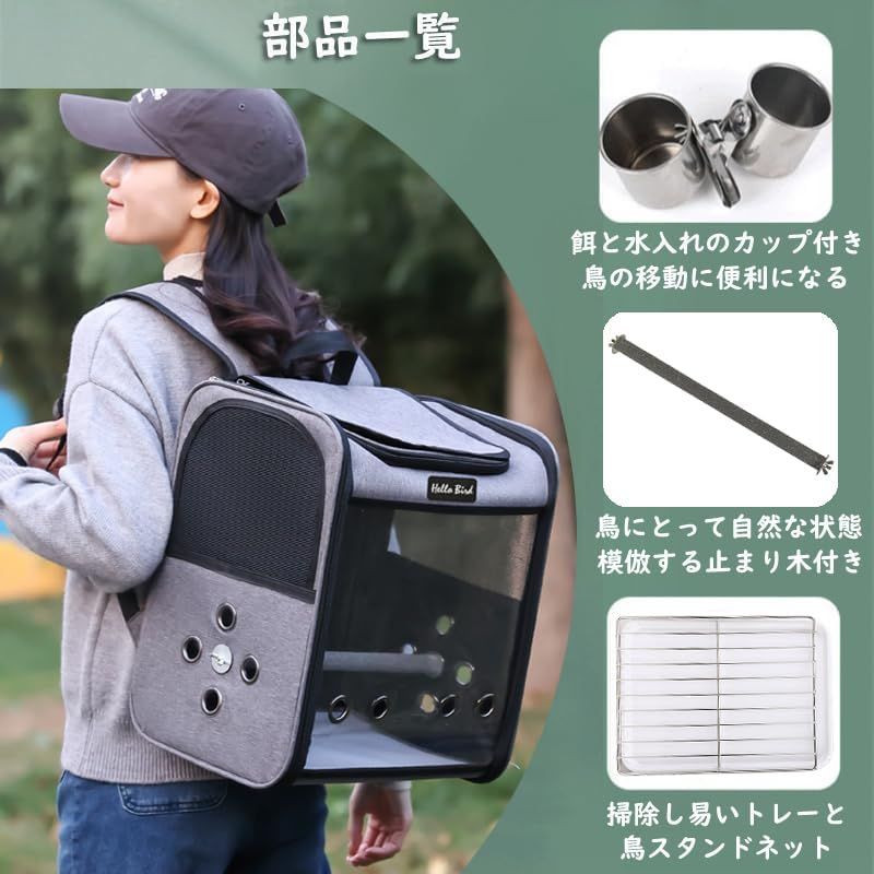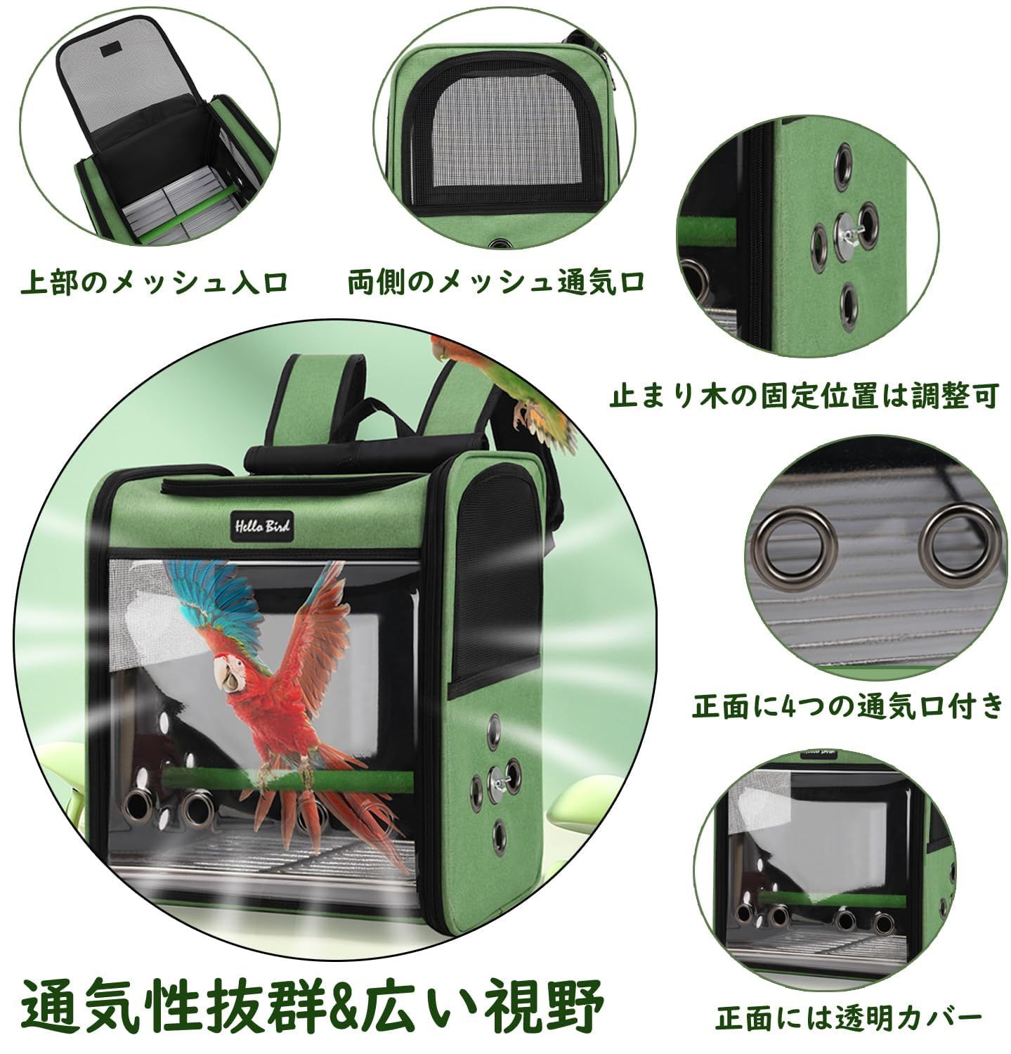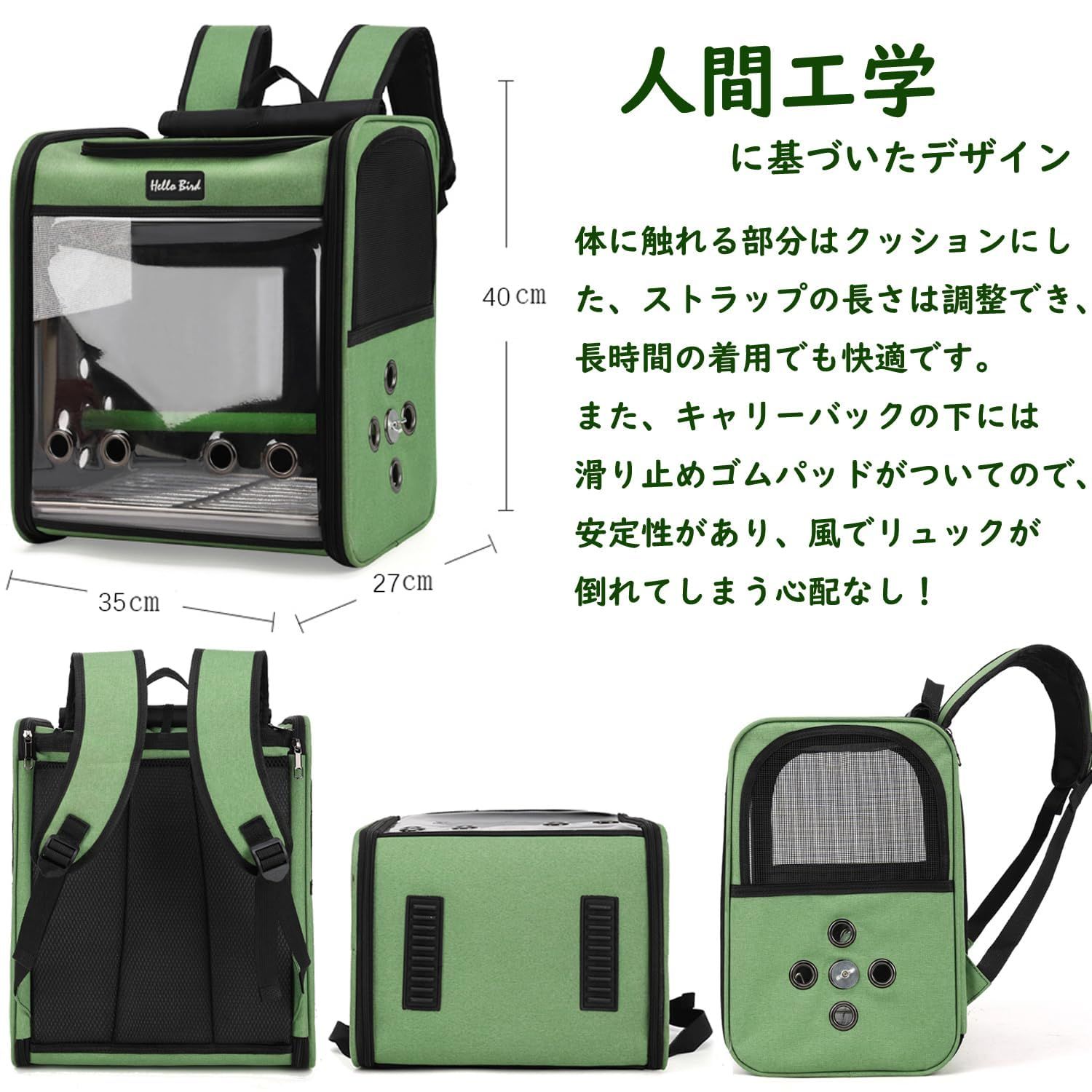 広い視野:キャリーリュック全体は鳥が周囲の環境を確認できる透明な窓やメッシュ素材を使用することで、鳥により広い視野を提供し、鳥の過敏な圧力も軽減します。特に、動物病院や旅行先などでの不安を軽減するのに役立ちます。