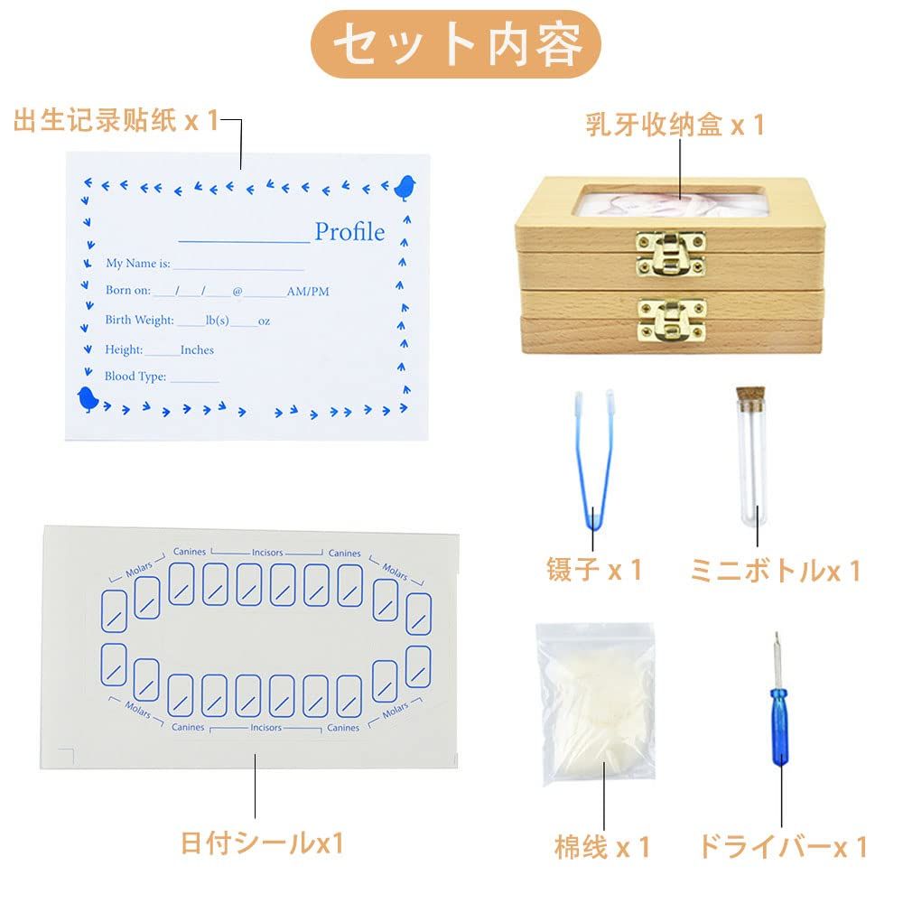 【セット内容】乳歯ケース×1;誕生日記録シール×2;日付シール×2 ;脱脂綿×1;ピンセット×1;うぶ毛ミニボトル×1;ドライバー×1;サイズ:14*10.9*3.1CM