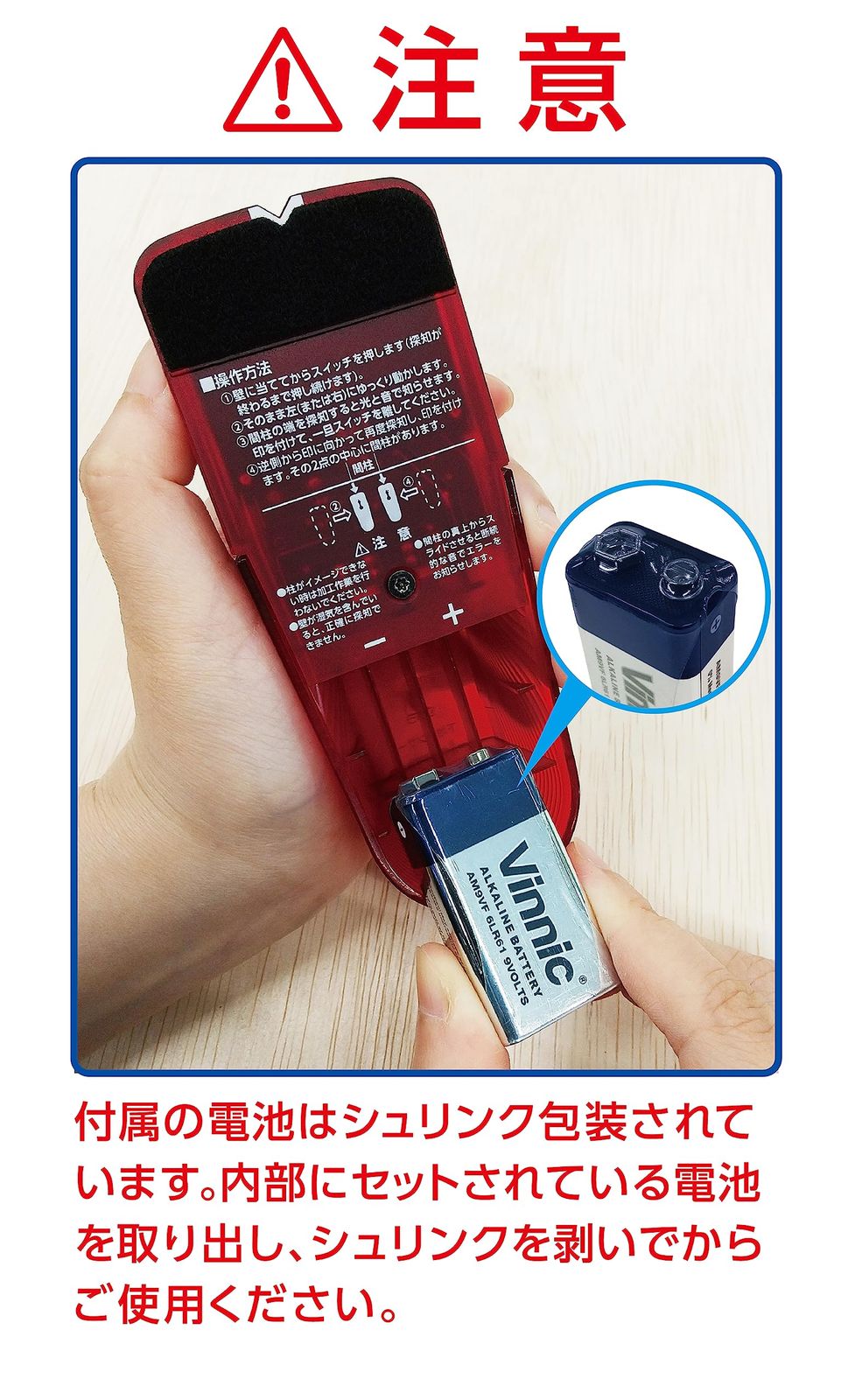 付属の電池は動作確認用のモニター電池ですので、ご使用の際は新しい電池をご用意ください(電源 9Vアルカリ乾電池×1個 ※ビニールの被覆を剥いでからご使用ください)