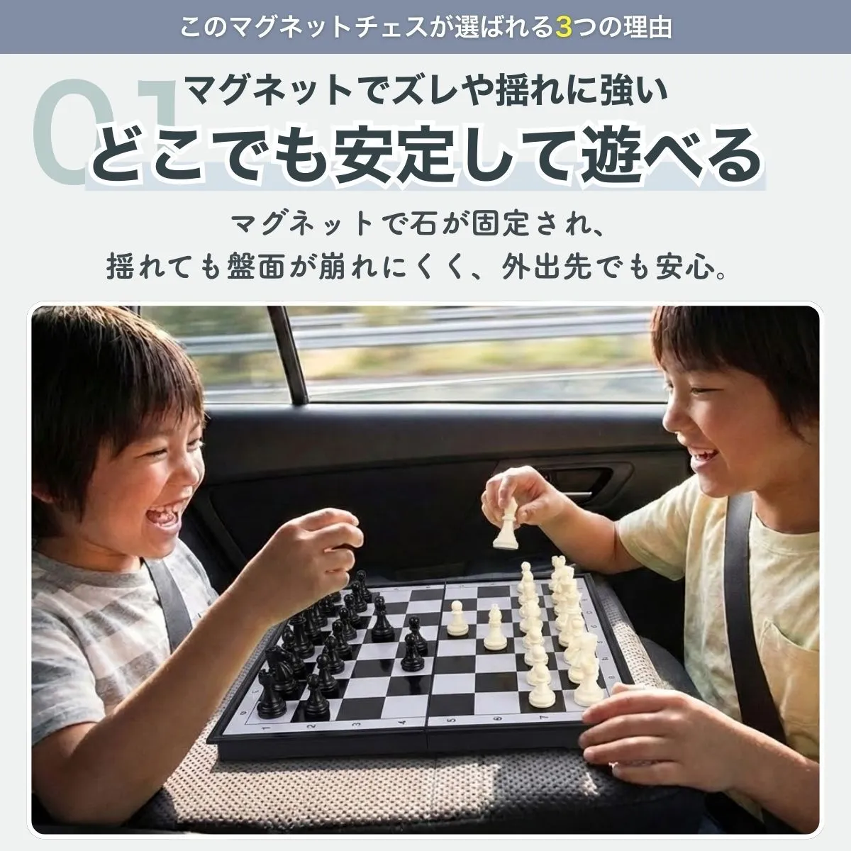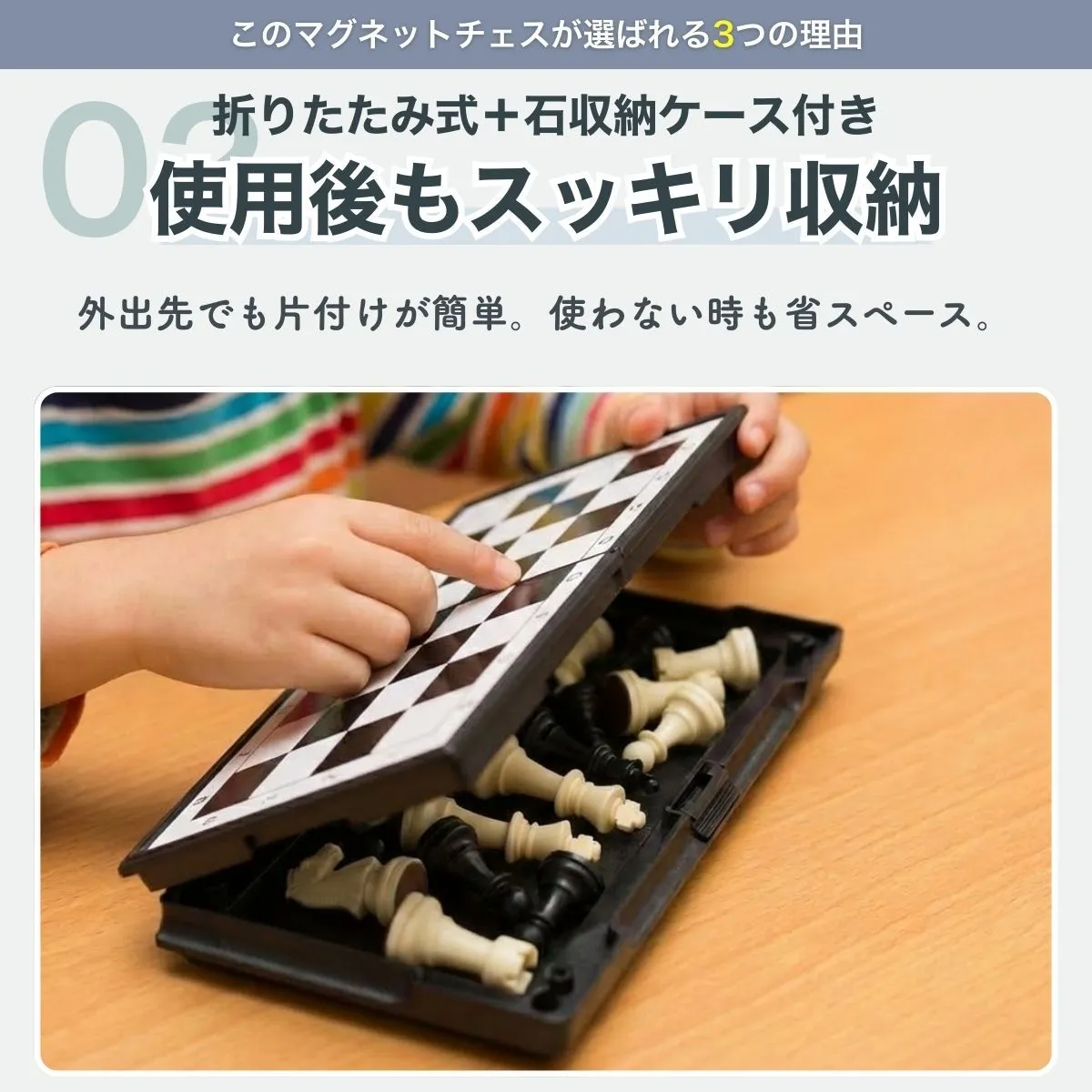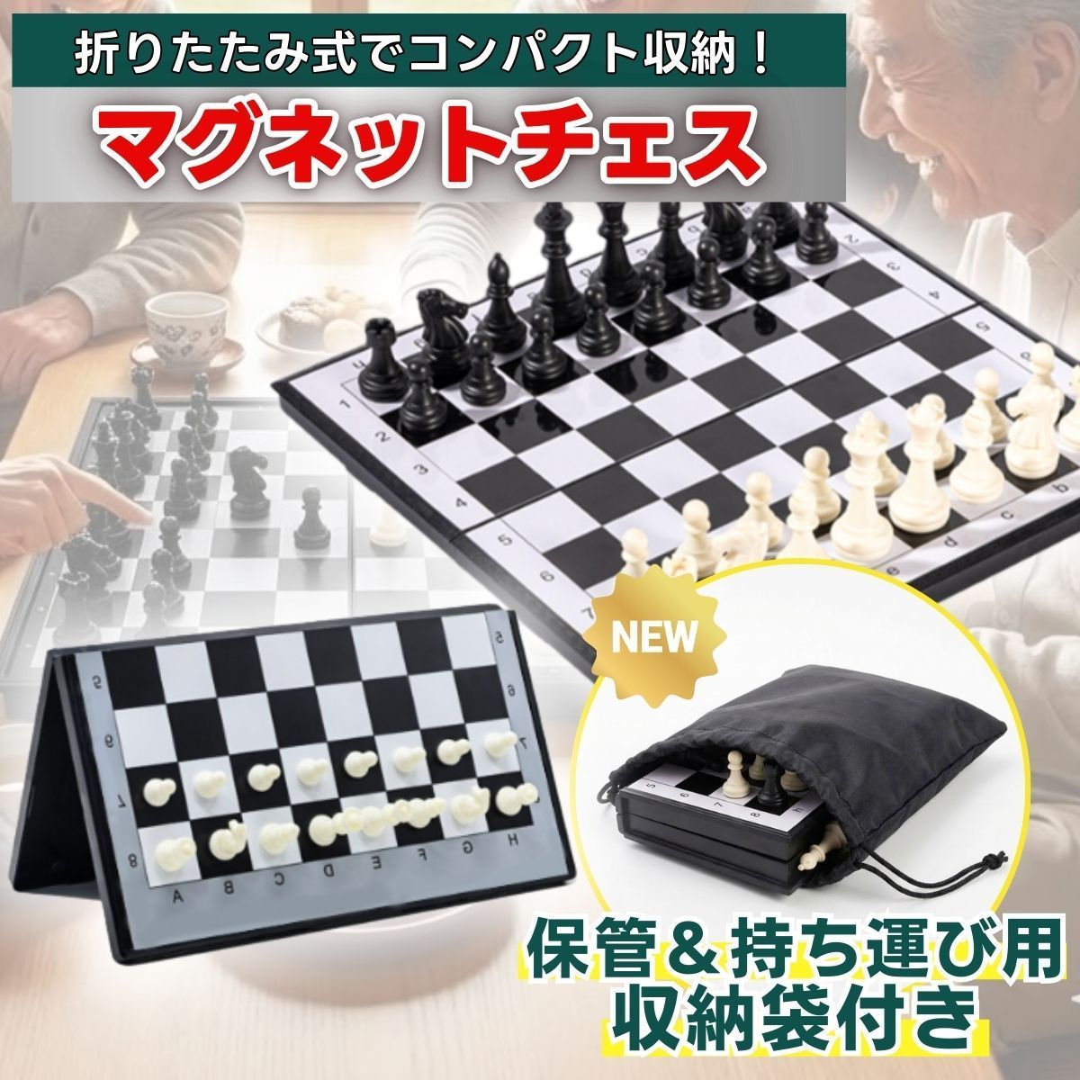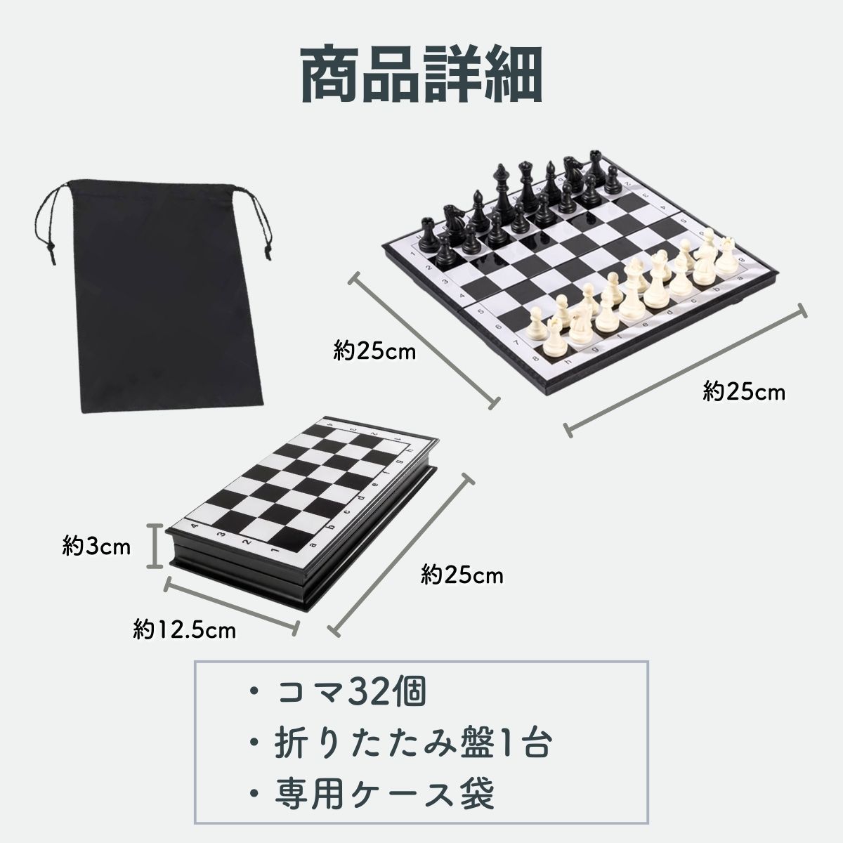 【こんなシーンにおすすめ】 ・旅行や帰省先で ・家族や友人との知的な遊びに ・自宅での趣味時間に ・チェスを始めたい方の入門用として 「一局だけ」のつもりが、ついもう一局。 セット内容 ・折りたたみチェス盤 ×1 ・チェス駒 一式(32個) ・専用収納袋 ×1 サイズ(約) ・展開時:25cm × 25cm ・折りたたみ時:25cm × 12.5cm × 高さ3cm 対象年齢 ・6歳以上 (※小さなお子様が遊ぶ場合は、保護者の方と一緒にお楽しみください) 関連キーワード:チェス セット 初心者 チェスセット マグネット 折りたたみ ボードゲーム 盤 ゲーム 携帯 持ち運び コンパクト 旅行用 小学生 大人 2人 知育 初心者 おもちゃ 子供 磁石 暇つぶし 送料無料 アウトドアゲーム 車内 ホームパーティー 対戦 子供向け 対戦ゲーム オセロ 将棋 ズレない ファミリーゲーム 車中用 一体型 防水 知育玩具 頭脳ゲーム 論理的思考 集中力 低学年 高学年 家族 親子
