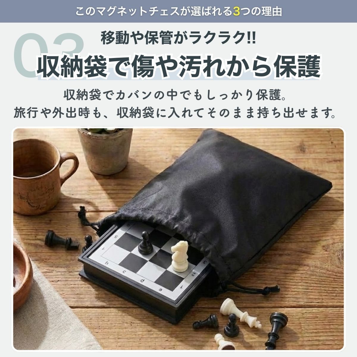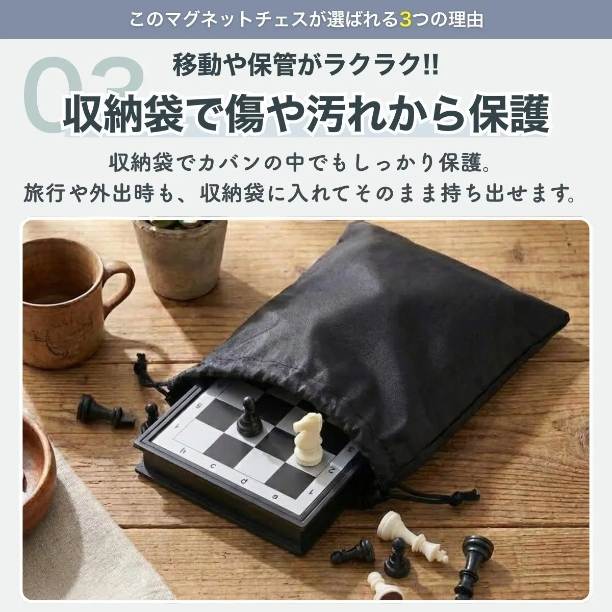 【折りたたんでコンパクトに収納】 チェス盤は折りたたみ式。 使用後はコンパクトにまとめて、付属の収納袋に入れて持ち運べます。