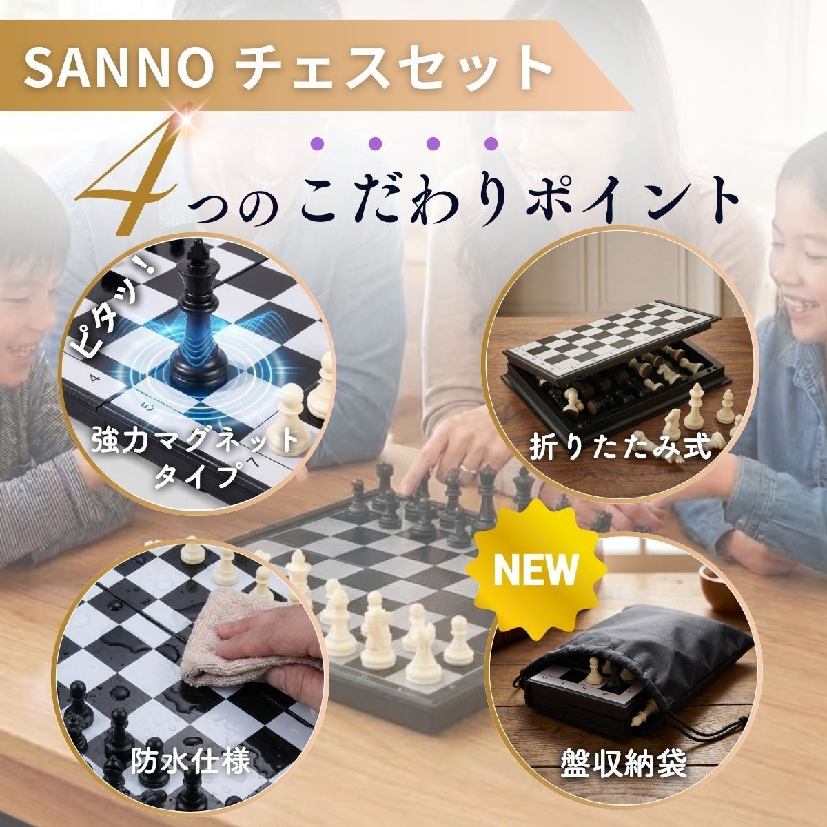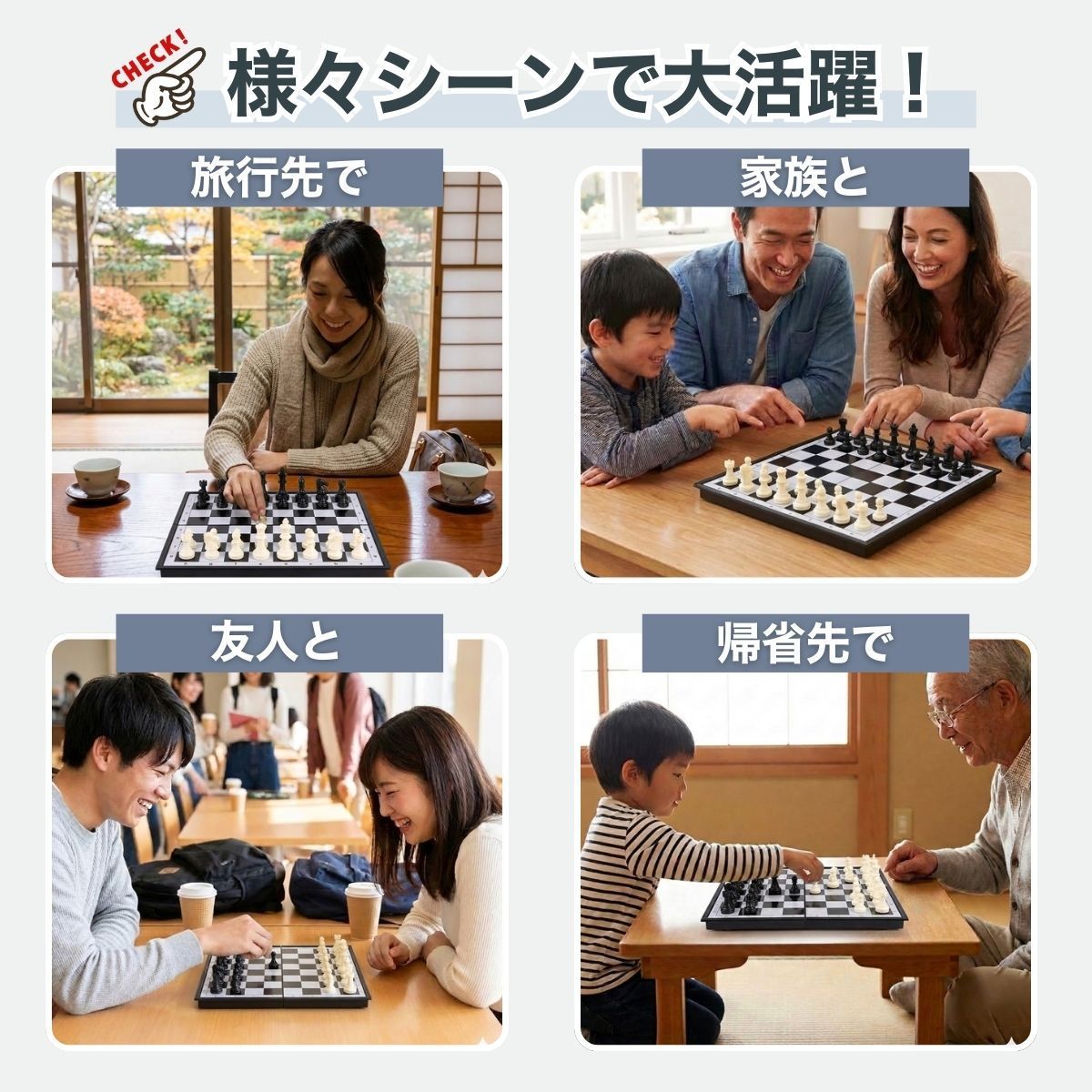 【折りたたみ式 チェスセット】 家族と、友人と、旅先で。 盤を広げれば、静かな駆け引きが始まる世界的定番ゲームです。