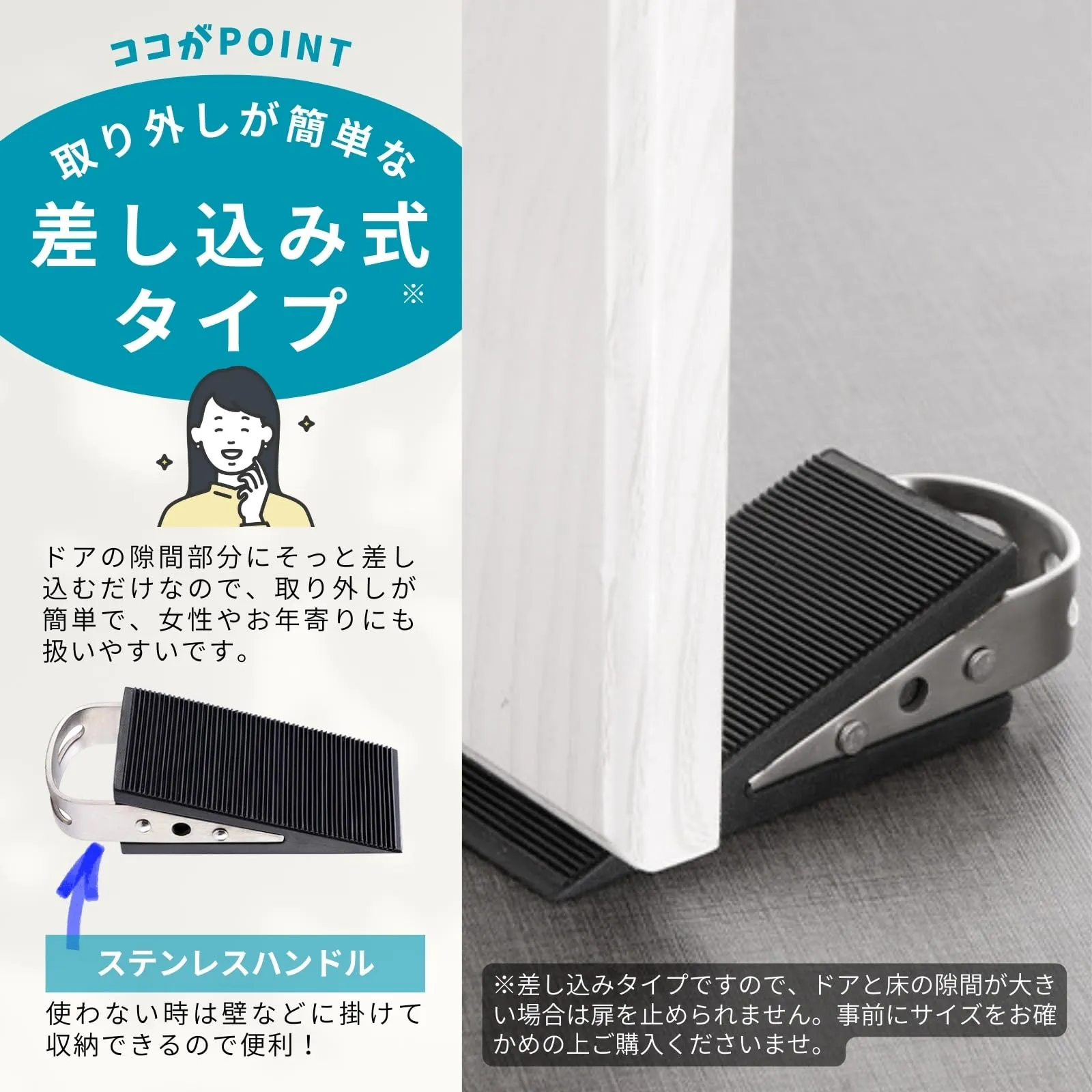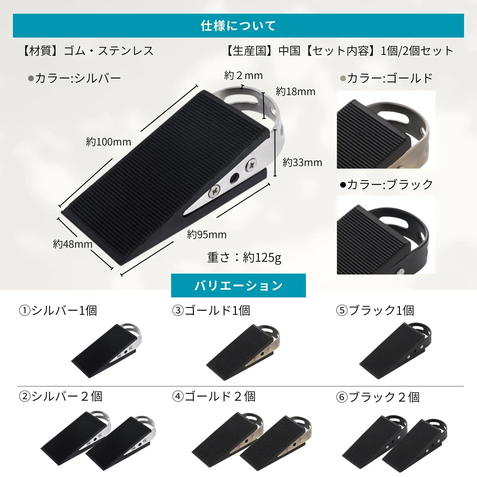 サイズ(約):95×48×33mm 重さ(約):125g/個 カラー:シルバー/ゴールド/ブラック 素材:ゴム・ステンレス セット内容:1個/2個 生産国:中国 ※差し込みタイプですので、ドアと床の隙間大きい場合は扉を止められません。事前にサイズをお確かめの上ご購入くださいませ。