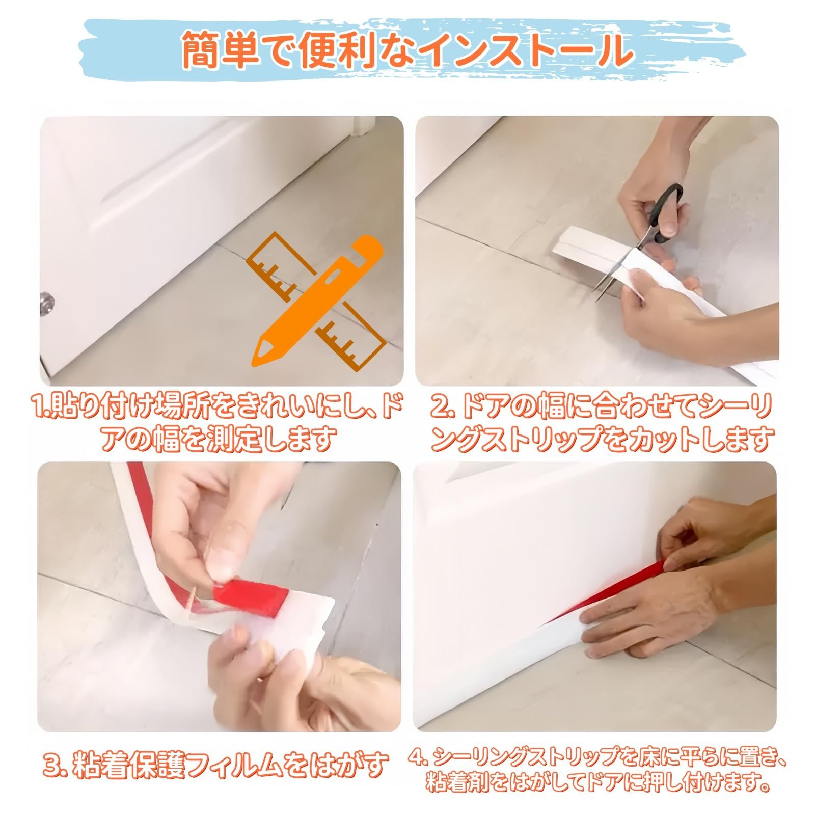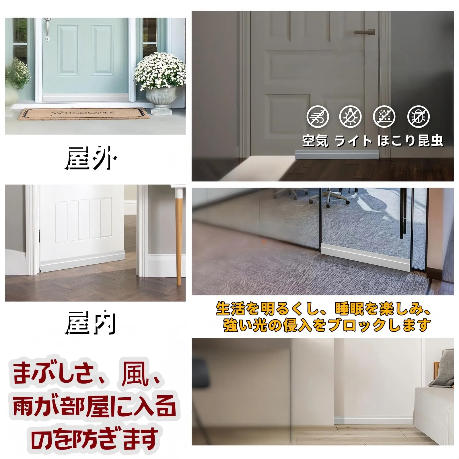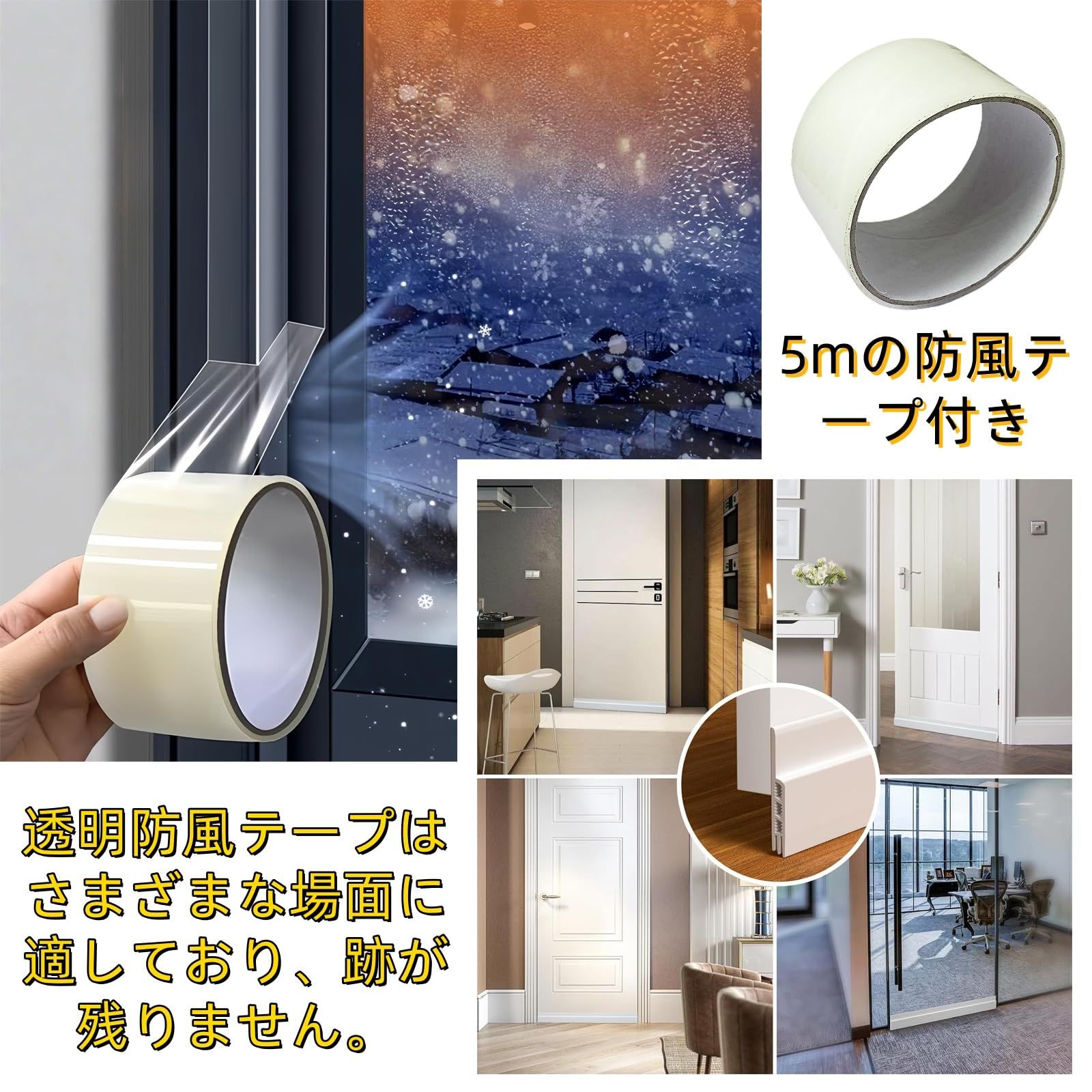 【セット内容と特徴】 ? ドア下部シール (1m/本) 室内ドアの底部の隙間にぴったりフィットし、気流、ほこり、騒音、蚊や虫の侵入を効果的に遮断します。 ? 透明隙間テープ (5m/巻) - 高透明で目立たない:窓枠やドア枠に貼っても目立ちにくく、美観を損ないません。 - 剥がし無痕:特殊な粘着剤を使用しているため、しっかり粘着しながらも**剥がした後に糊残りがほとんどありません**。賃貸住宅の方でも安心してお使いいただけます。
