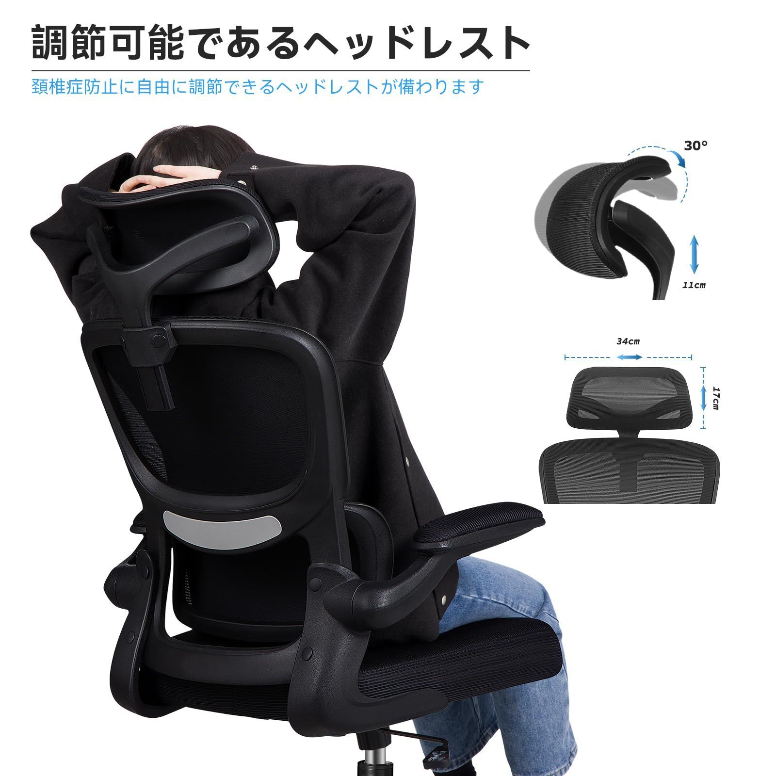 【通気性・快適さ】背もたれ・座面共に通気性に優れたメッシュ素材が使用されます。メッシュの弾力性が背中にフィットし、厚い座面は快適さをもたらします。可動式ヘッドレストも首の疲れを取ります。