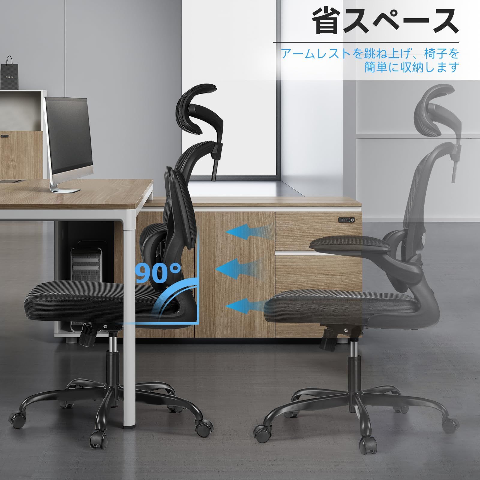 【90°跳ね上げ式アームレスト】90度まで跳ね上げられるアームレスト、様々なニーズに対応します。椅子を使用しない時にスッキリと収納可能、省スペースです。アームレストを上げると胡坐をかいてギターでも引けます。