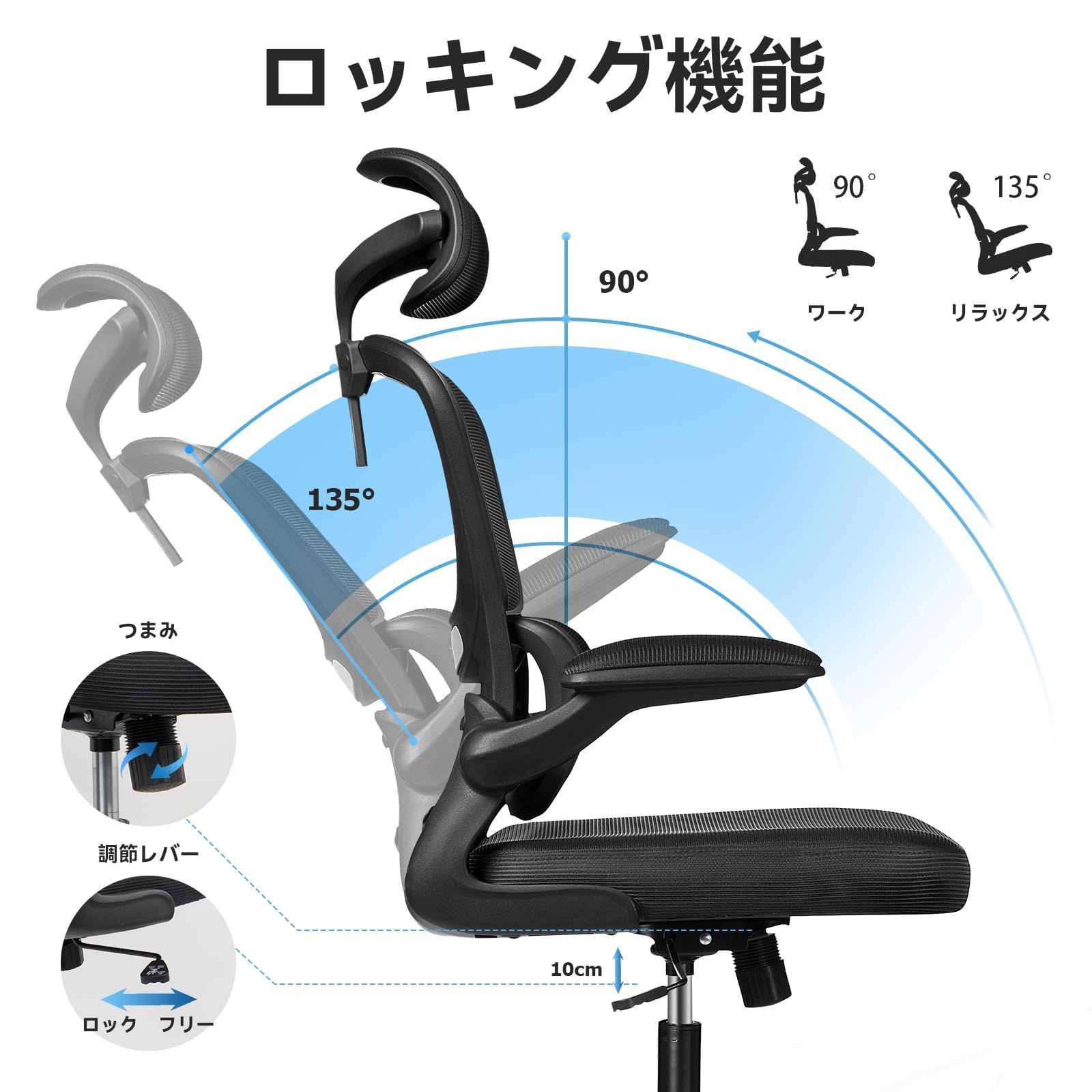 【実用性満点の多機能】 ◎約45度ロッキング機能 ◎10cm昇降機能 ◎スムーズに移動できる静音キャスター ◎360度回転座面