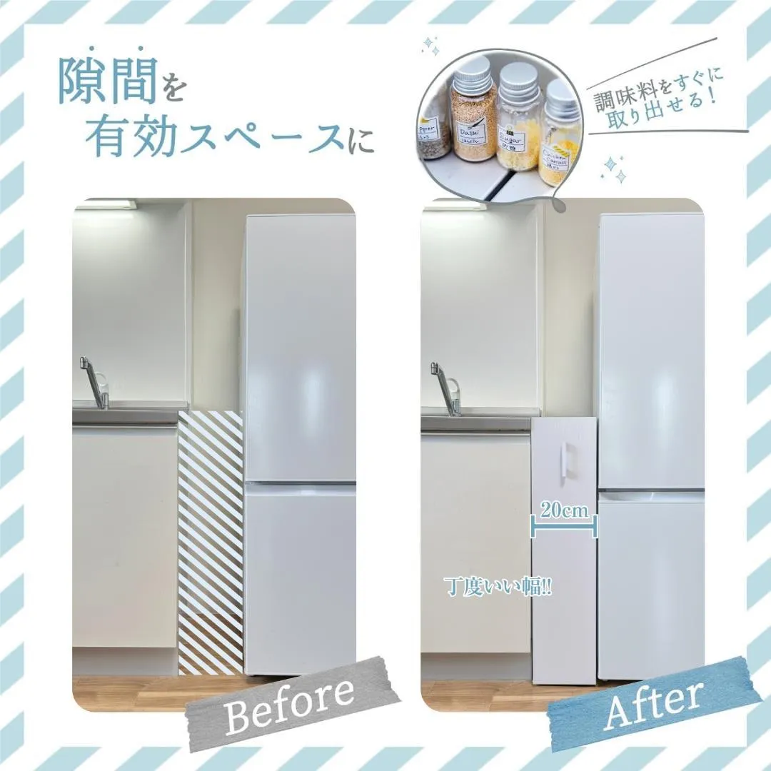 【キッチンの隙間を“収納スペース”に変える】 冷蔵庫横やシンク横のわずかな隙間を有効活用できるスリムワゴンです。 幅20cmのコンパクト設計ながら、3段収納+天板スペースで抜群の収納力。 調味料や缶詰、ペットボトルなどをまとめて整理できます。 キャスター付きでスムーズに引き出せるため、掃除や模様替えも簡単。 狭いキッチンでも効率よく使える隙間収納ラックです。