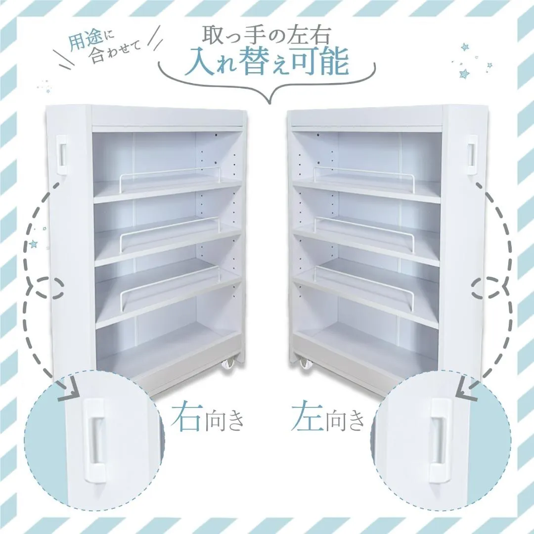 【左右どちらでも使える利便性】 取っ手は左右どちらにも付け替え可能。 冷蔵庫の右側・左側、どちらに設置しても使いやすくレイアウトできます。 キャスター付きで移動もスムーズ。 模様替えや掃除の際も手軽に動かせるので、日常の使いやすさを追求した仕様です。