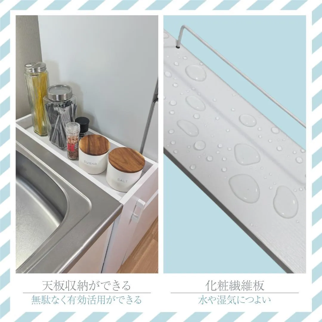 【水・汚れに強く、お手入れ簡単】 棚板にはメラミン樹脂加工を施した化粧繊維板を採用。 水や汚れに強く、サッと拭くだけで清潔に保てます。 キッチンの油はねや洗面所の水滴も気になりません。 毎日使う場所だからこそ、使い勝手と耐久性にこだわりました。
