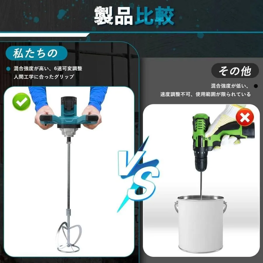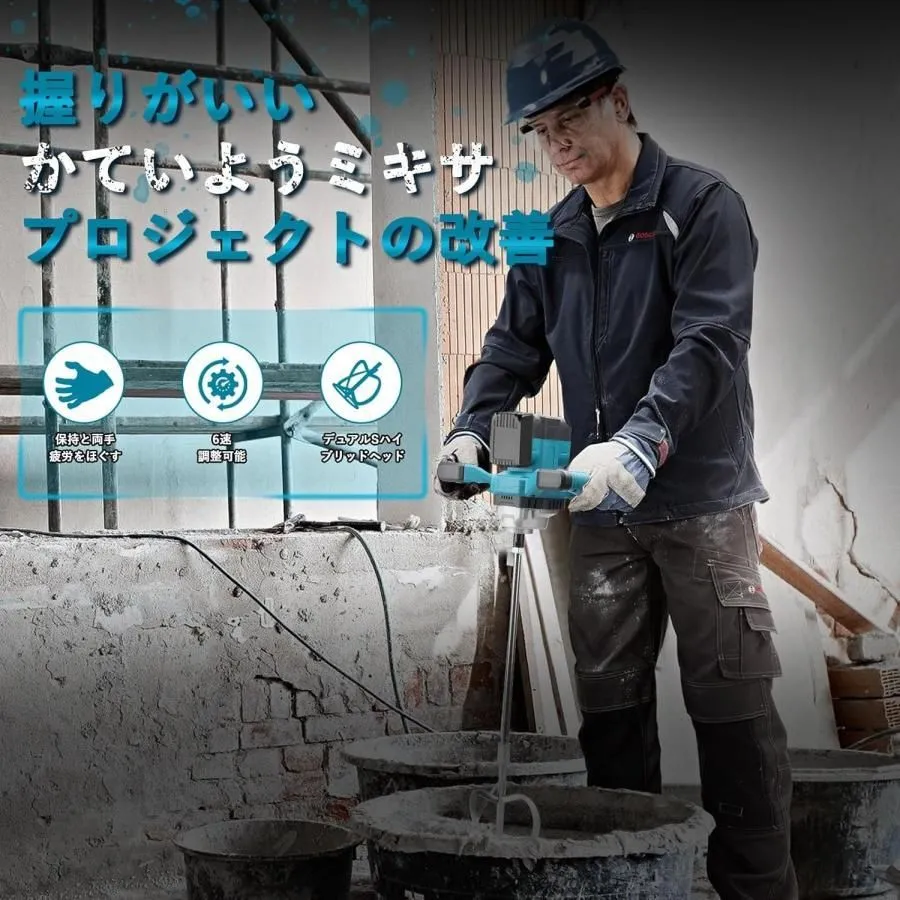 【堅牢な金属ギアボックス】 厚手金属製ギアボックスと外装により耐衝撃性・耐摩耗性を向上。厳しい現場環境での長時間使用に耐えます。付属のS型スパイラルミキサーロッドとW型十字ミキシングヘッドのダブルヘッド構成で、多様な材料の混合効率を向上させつつ耐久性を確保。