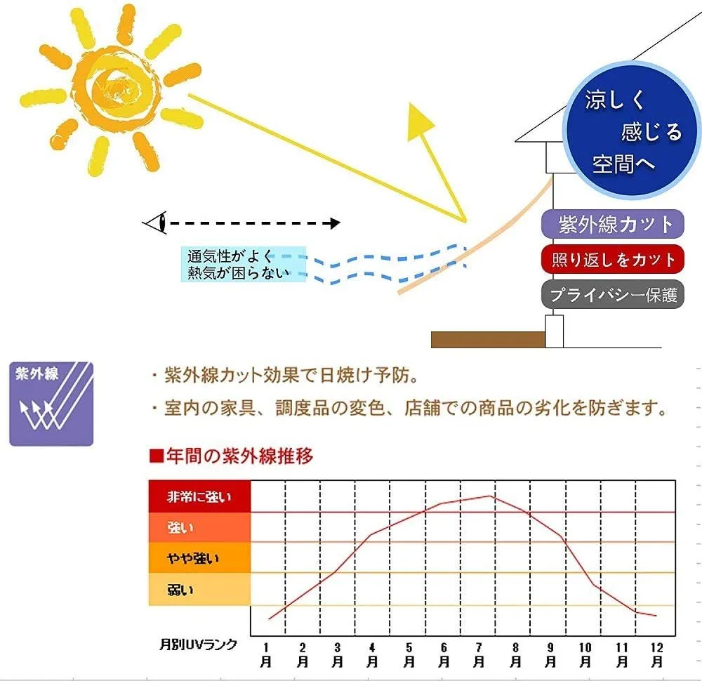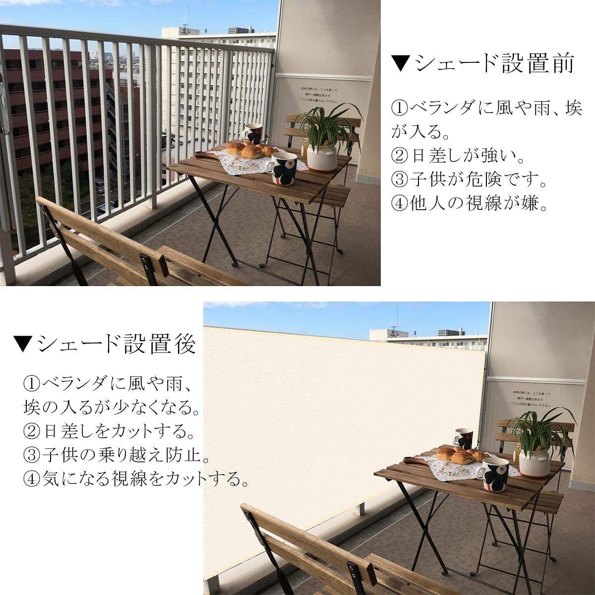 【UV紫外線カット】 紫外線に強く色褪せにくい優れた耐候性。直射日光を遮り、紫外線を約95%カットしてくれます、遮光率は約85%。シェード下の地表温度も下げ、風も通しますので夏でも外で快適に過ごすことができます。窓際に取り付けることで、日差しなどの太陽熱の影響を和らげ、室温上昇を抑制します。エアコンの使用も抑えられますので、節電に最適です。