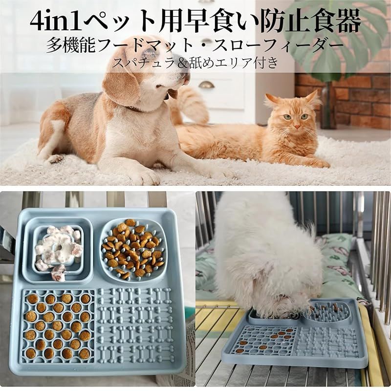 【商品説明】 4 in 1多機能設計: スローフードエリア、舐めエリアを含む多機能設計で、ペットのさまざまな食事ニーズに対応します。食べ物を簡単にマットに塗布できるスパチュラが付属しております。 スローフードエリア: 早食いを防止し、ペットの食事時間を延ばす特別なエリア。ドッグフード、キャットフード、おやつに最適です。舐めエリアにはピーナッツバターやヨーグルトを置くことができ、ペットのストレス解消します。 強力な吸着力: 異なるテクスチャーがペットの興味を引き、マットの裏面に吸着力の高い吸盤があり、木材、タイル、ガラス、冷蔵庫など様々な表面にしっかりと固定され、使用中にマットが滑ることを防ぎます。 簡単なお手入れ: 食器洗い機で簡単に洗浄可能で、手間なく常に清潔を保てます。使用後は直接水でさっとすすぐだけでも清潔を保てます。 安全で耐久性のある素材: 高品質なシリコン素材を使用しており、ペットが舐めても長持ちするデザインです。軽量コンパクトで使いやすい、持ち運びに便利。屋内外問わず、ペットとの時間を楽しく過ごすためのアイテムです。