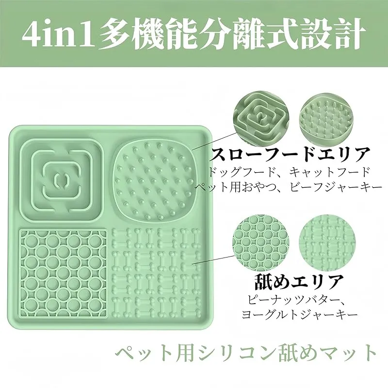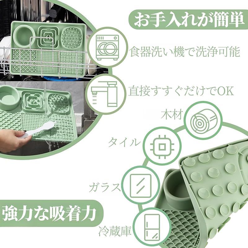 【商品概要】 4 in 1多機能設計: スローフードエリア、舐めエリアを含む多機能設計で、ペットのさまざまな食事ニーズに対応します。食べ物を簡単にマットに塗布できるスパチュラが付属しております。 スローフードエリア: 早食いを防止し、ペットの食事時間を延ばす特別なエリア。ドッグフード、キャットフード、おやつに最適です。舐めエリアにはピーナッツバターやヨーグルトを置くことができ、ペットのストレス解消します。 強力な吸着力: 異なるテクスチャーがペットの興味を引き、マットの裏面に吸着力の高い吸盤があり、木材、タイル、ガラス、冷蔵庫など様々な表面にしっかりと固定され、使用中にマットが滑ることを防ぎます。 簡単なお手入れ: 食器洗い機で簡単に洗浄可能で、手間なく常に清潔を保てます。使用後は直接水でさっとすすぐだけでも清潔を保てます。 安全で耐久性のある素材: 高品質なシリコン素材を使用しており、ペットが舐めても長持ちするデザインです。軽量コンパクトで使いやすい、持ち運びに便利。屋内外問わず、ペットとの時間を楽しく過ごすためのアイテムです。