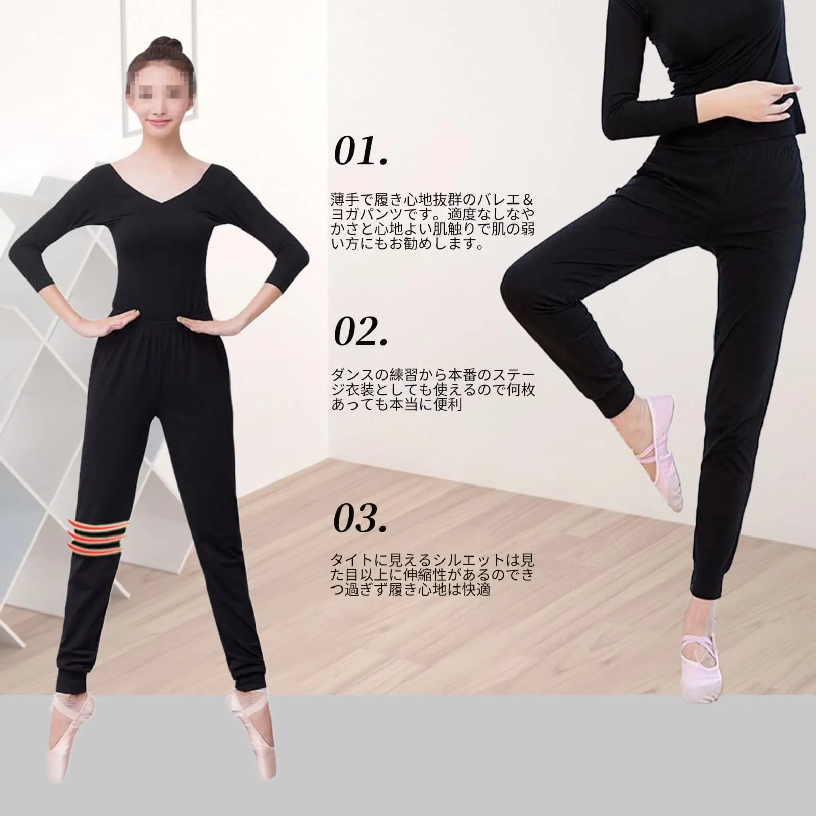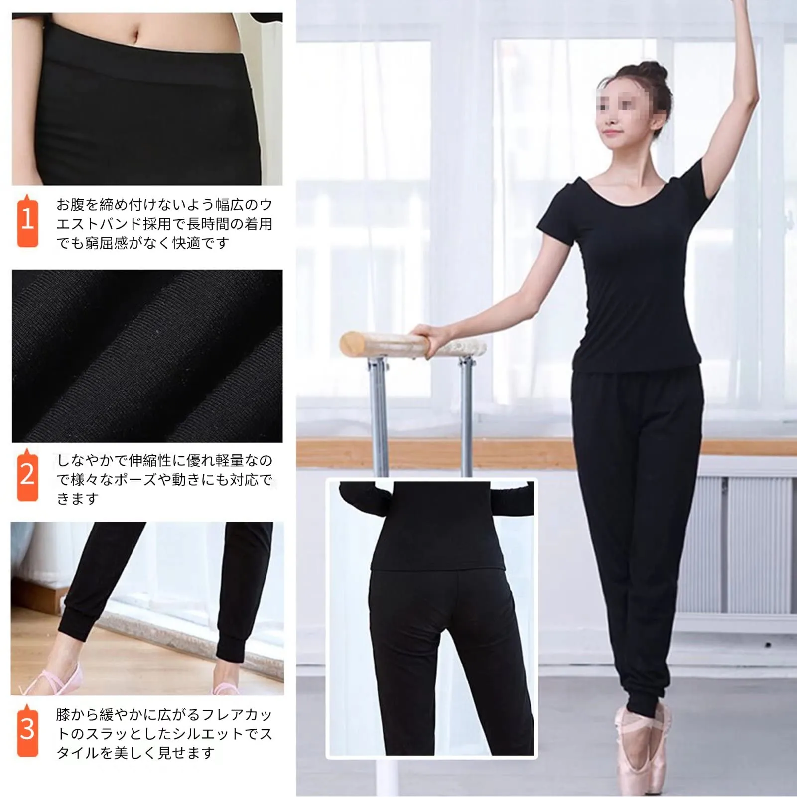 【履き心地抜群】薄手で履き心地抜群のバレエ&ヨガパンツです。適度なしなやかさと心地よい肌触りで肌の弱い方にもお勧めします。ヨガウエアとしてはもちろん、フィットネスやダンスウエアとしても最適です。また、ルームウエアや旅行先での部屋着などリラックスしたい時のご使用もおすすめです。ダンスの練習から本番のステージ衣装としても使えるので何枚あっても本当に便利! タイトに見えるシルエットは見た目以上に伸縮性があるのできつ過ぎず履き心地は快適♪ 最後までご確認頂き誠にありがとうございました。 上記をご確認頂き、ご購入いただけましたら幸いです。 何かご不明な点がございましたらお気軽にメッセージからお問い合わせ下さい。