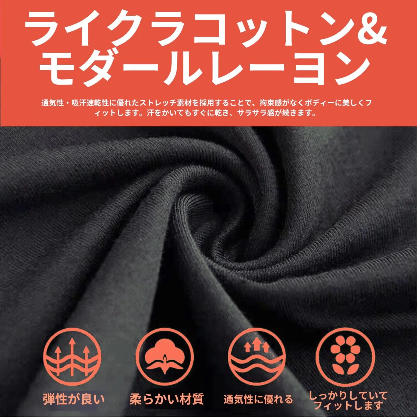 【素材】ライクラコットン&モダールレーヨン。通気性・吸汗速乾性に優れたストレッチ素材を採用することで、拘束感がなくボディーに美しくフィットします。汗をかいてもすぐに乾き、サラサラ感が続きます。