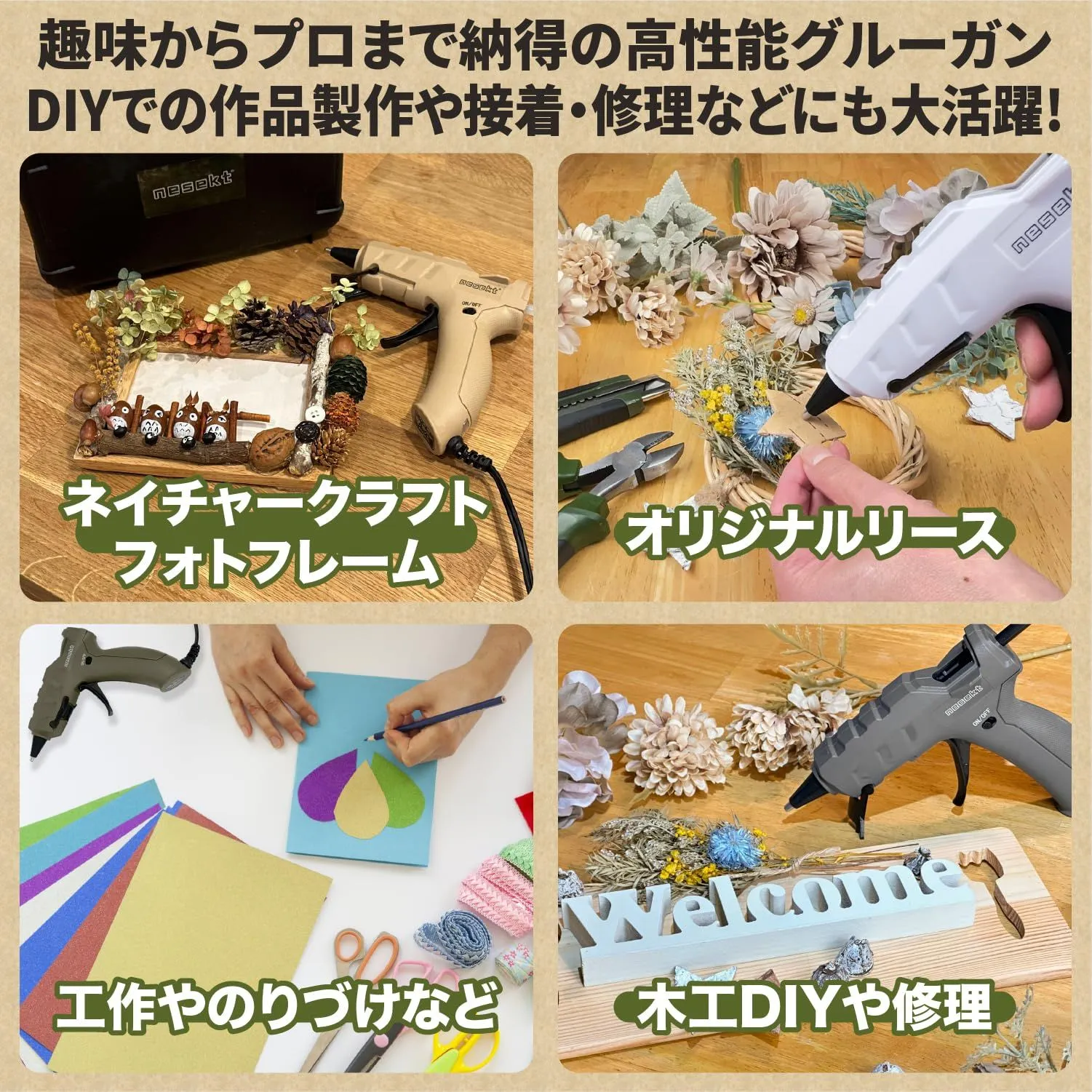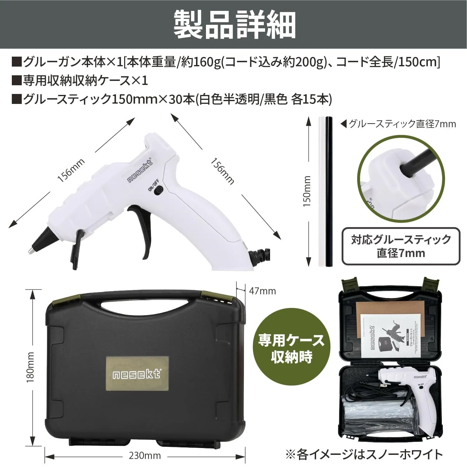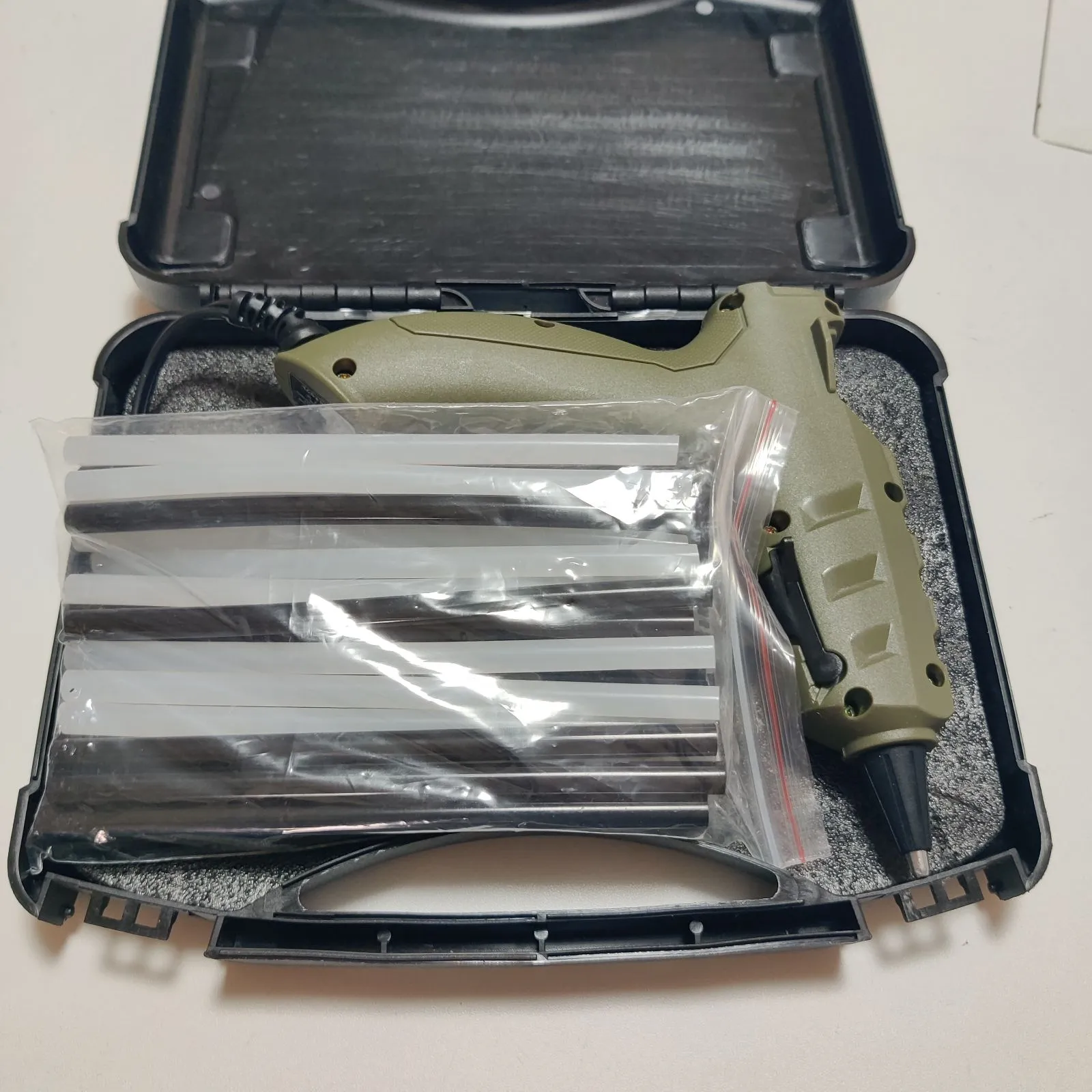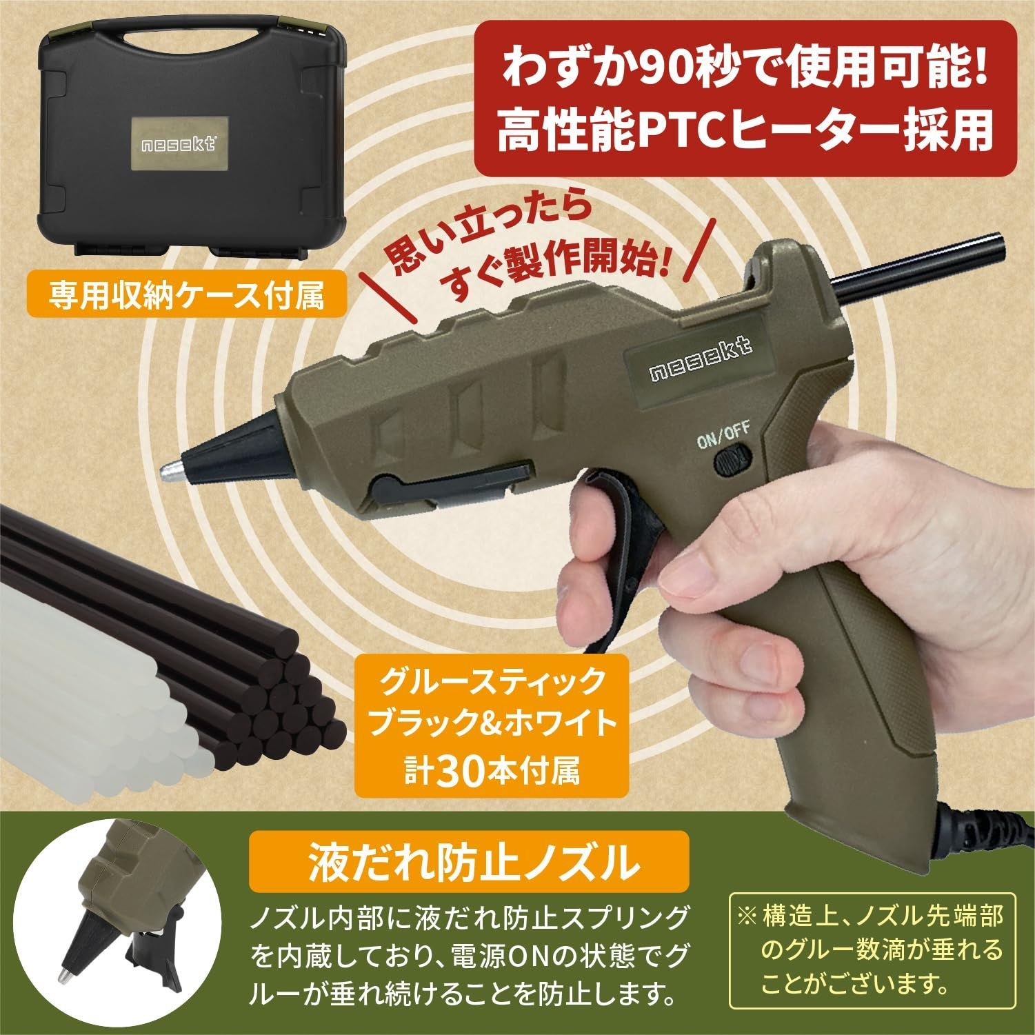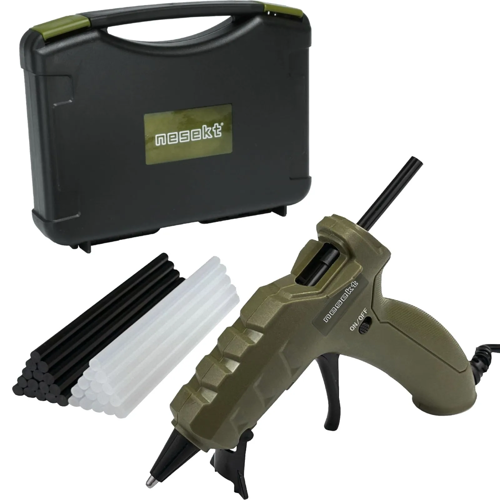 [ネセクト] 強力グルーガンセット AC100V/50W 専用収納ケース グルースティック白&黒 30本付 DIY (オリーブグリーン)